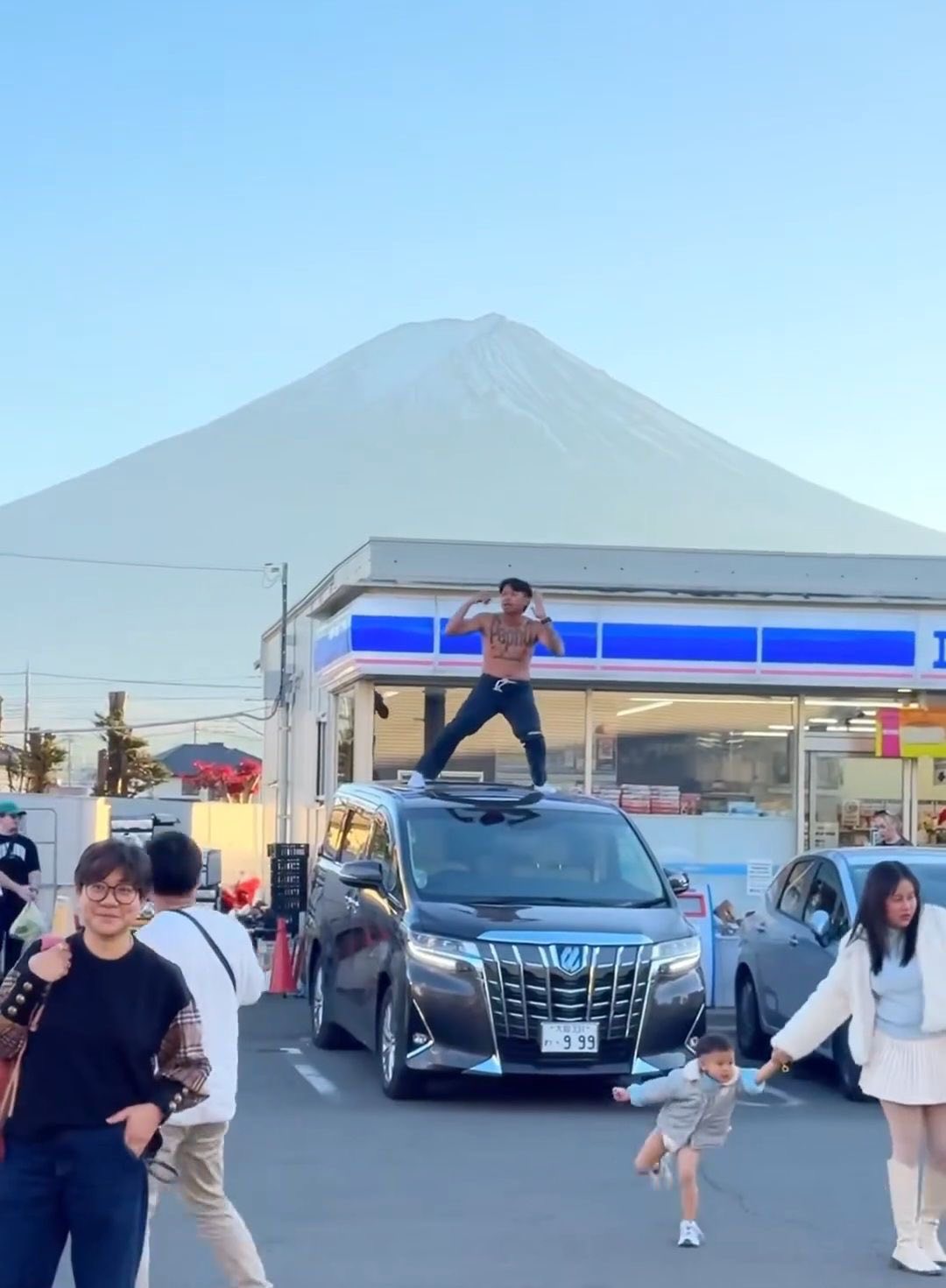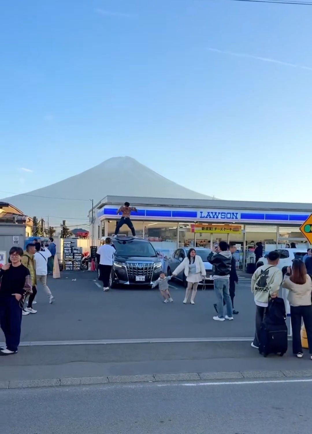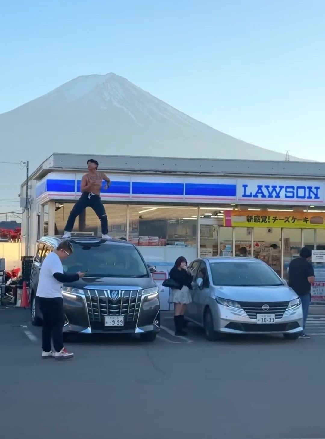 จุดเกิดเหตุคือหน้าร้านสะดวกซื้อ Lawson ที่มีฉากหลังเป็นภูเขาไฟฟูจิ ซึ่งเป็นแลนด์มาร์กยอดฮิตที่คนญี่ปุ่นและนักท่องเที่ยวให้ความสำคัญเรื่องระเบียบความสงบ