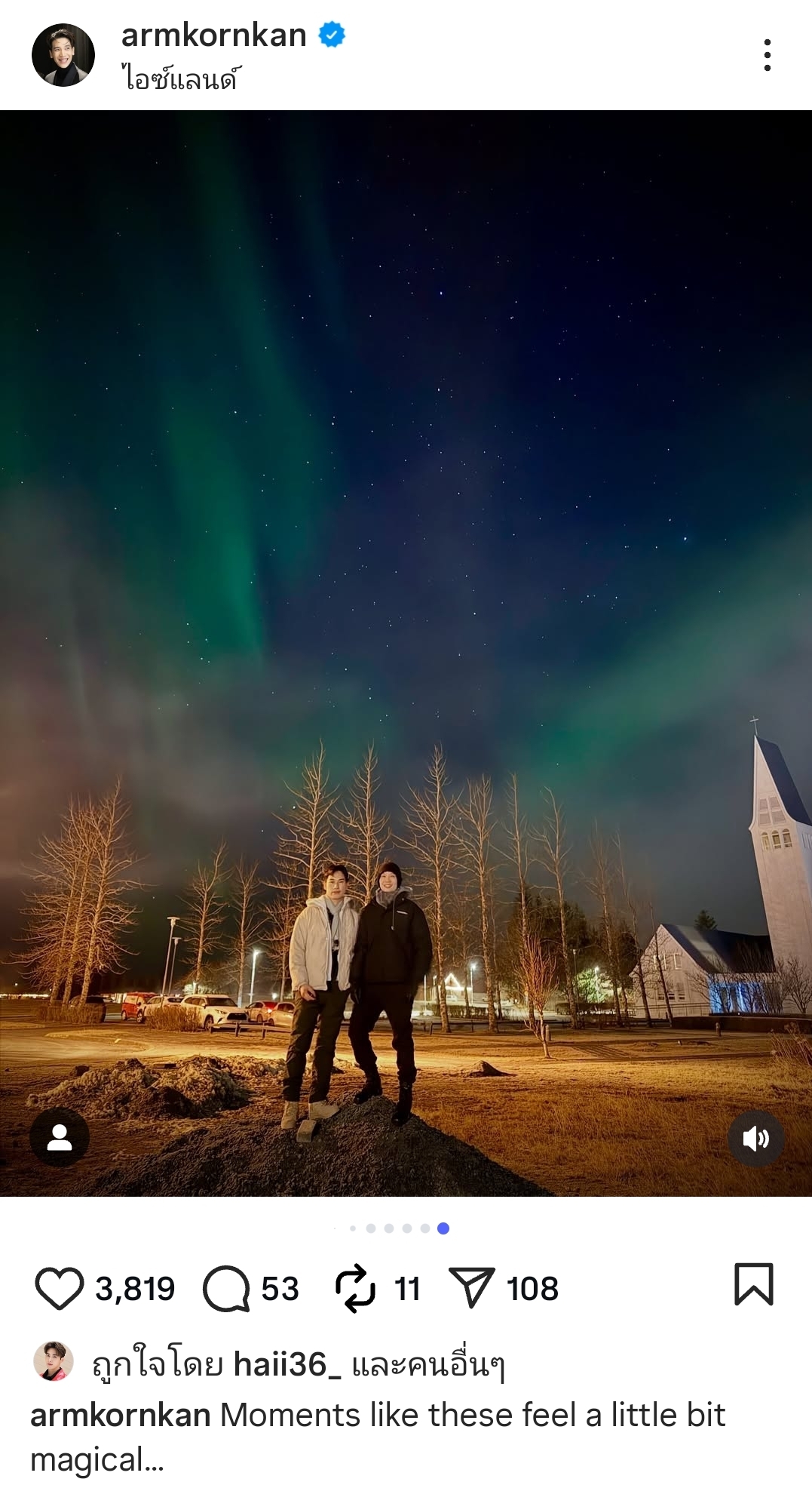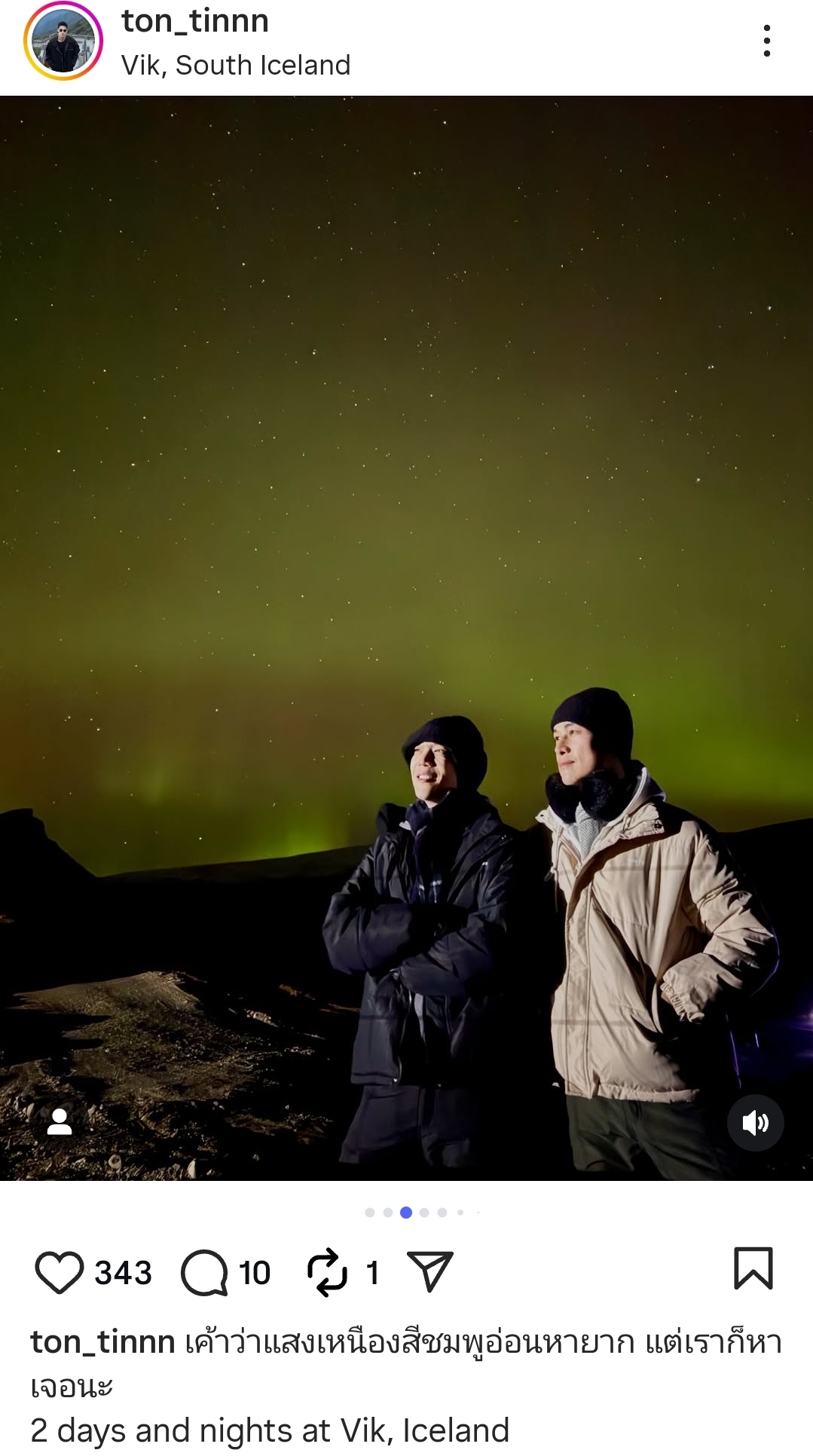 ​แต่ที่ทำเอาพีคสุดๆ และต้องยกให้เป็นภาพประวัติศาสตร์ของทริปนี้เลยก็คือ ภาพถ่ายคู่กับ “แสงเหนือ” (Aurora Borealis)! ที่เมืองวิก (Vik, South Iceland) โดยทาง “หมอตินน์” ถึงกับแคปชั่นว่า “เขาว่าแสงเหนือสีชมพูอ่อนหายาก แต่เราก็หาเจอ” ซึ่งภาพความสวยงามของแสงสีเขียวปนชมพูอ่อนที่ฉายอยู่บนท้องฟ้า ยามมีทั้งคู่ยืนเคียงข้างกัน ก็ยิ่งเสริมให้ภาพนี้มีความ “หวานมาก” และโรแมนติกแบบสุดๆ ไปเลย!