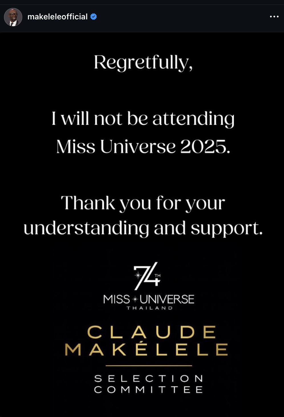 “ผมเสียใจที่ต้องแจ้งว่าผมไม่สามารถเข้าร่วมงาน Miss Universe 2025 ได้… ขอบคุณสำหรับความเข้าใจและการสนับสนุน” มาเกเลเลระบุสั้นๆ ผ่านโซเชียลมีเดีย
