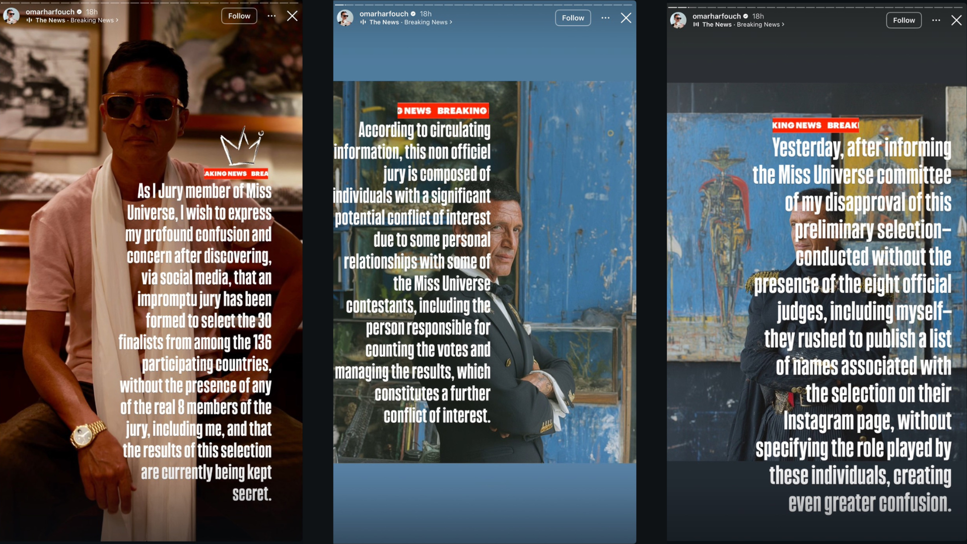 เมื่อวานนี้ (18 พฤษจิกายน) โอมาร์ ฮาร์ฟูช (Omar Harfouch) หนึ่งใน 8 คณะกรรมการผู้ตัดสินของ 74th Miss Universe ได้ประกาศลาออกจากตำแหน่งกลางอากาศ ก่อนวันแข่งรอบไฟนอลเพียงไม่กี่วัน