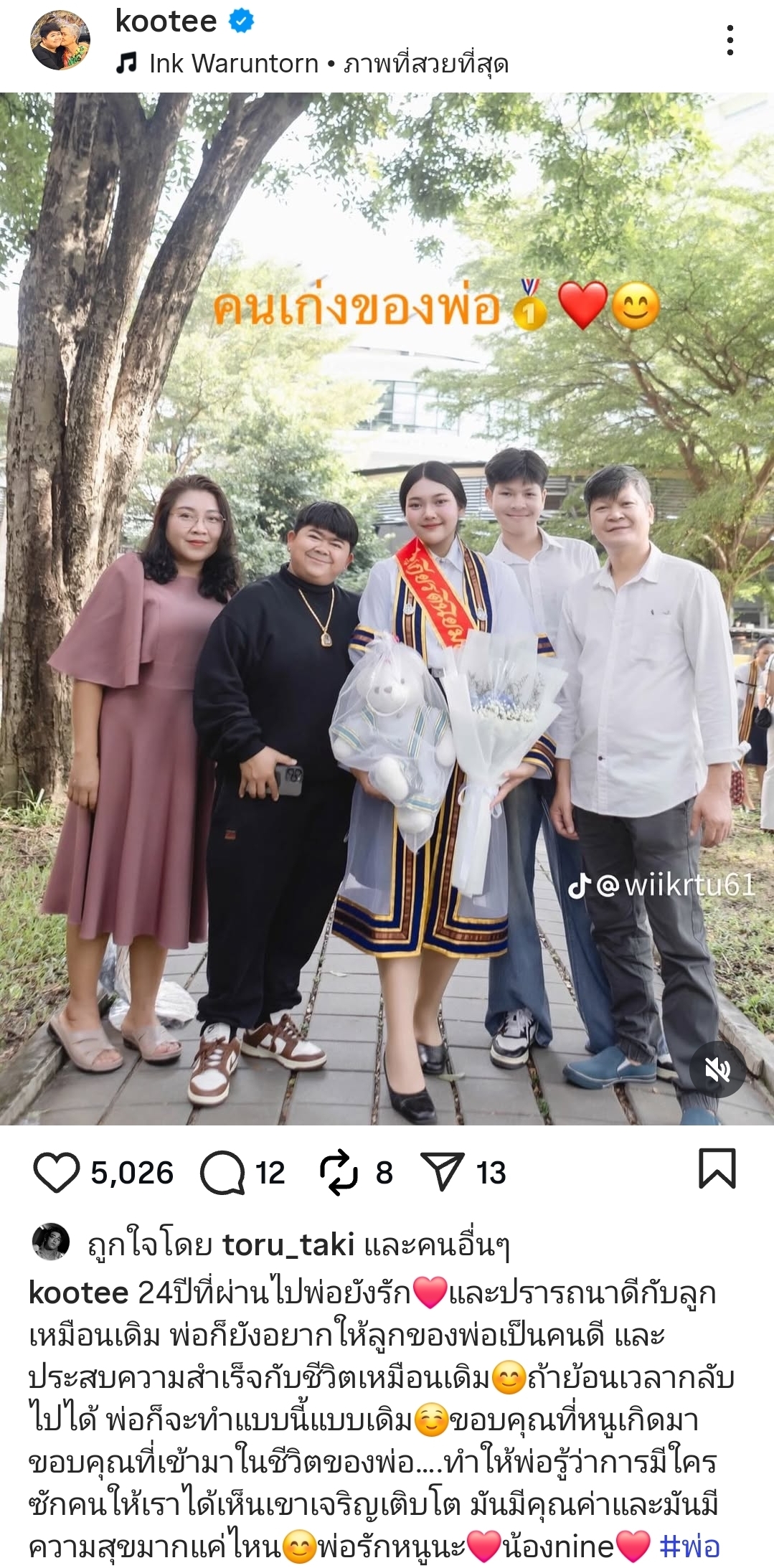 ​”24 ปีที่ผ่านไปพ่อยังรัก และปรารถนาดีกับลูกเหมือนเดิม พ่อก็ยังอยากให้ลูกของพ่อเป็นคนดี และประสบความสำเร็จกับชีวิตเหมือนเดิม ถ้าย้อนเวลากลับไปได้ พ่อก็จะทำแบบนี้แบบเดิม ขอบคุณที่หนูเกิดมา ขอบคุณที่เข้ามาในชีวิตของพ่อ…ทำให้พ่อรู้ว่าการมีใครสักคนให้เราได้เห็นเขาเจริญเติบโต มันมีคุณค่าและมันมีความสุขมากแค่ไหน พ่อรักหนูนะ น้องnine #พ่อ”