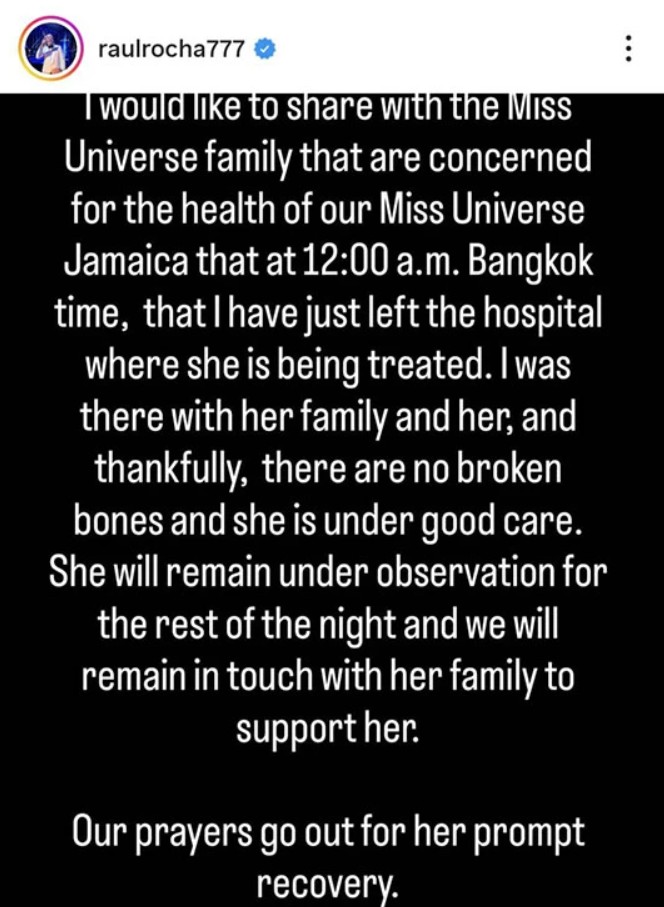 ราอูลยังระบุว่า นางงามจากจาไมกาจะยังอยู่ในการเฝ้าดูอาการอย่างใกล้ชิดตลอดทั้งคืน เพื่อความปลอดภัยสูงสุด พร้อมย้ำว่าองค์กรจะติดต่อและให้การสนับสนุนครอบครัวของเธออย่างต่อเนื่อง