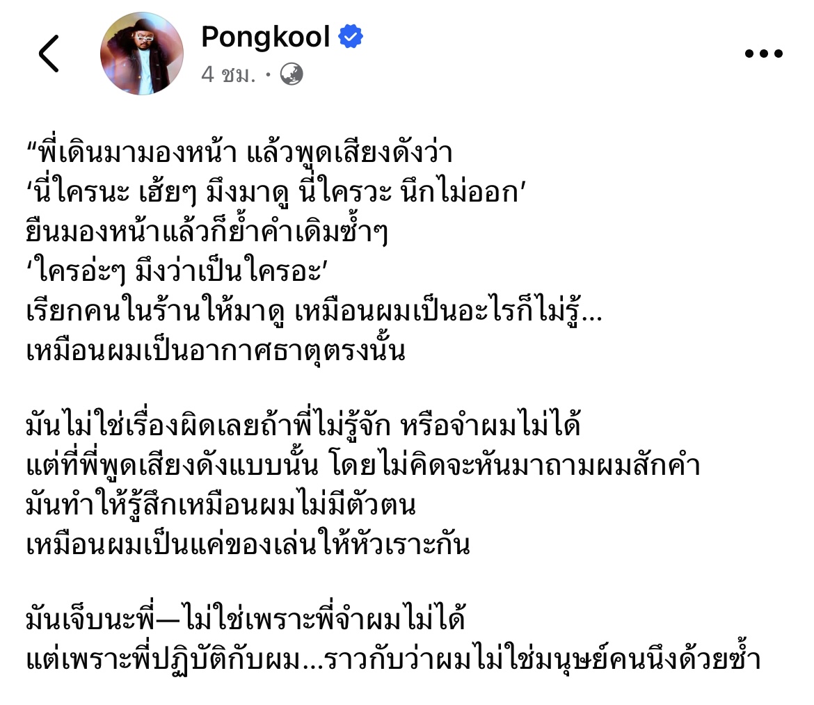 โดยวันนี้ (20 พ.ย. 68) ป๊อบ ปองกูล ได้โพสต์ข้อความลงเฟซบุ๊ก ระบุว่า “พี่เดินมามองหน้า แล้วพูดเสียงดังว่า ‘นี่ใครนะ เฮ้ย ๆ มึงมาดู นี่ใครวะ นึกไม่ออก’ ยืนมองหน้าแล้วก็ย้ำคำเดิมซ้ำ ๆ ‘ใครอ่ะ ๆ มึงว่าเป็นใครอะ’ เรียกคนในร้านให้มาดู เหมือนผมเป็นอะไรก็ไม่รู้…เหมือนผมเป็นอากาศธาตุตรงนั้น มันไม่ใช่เรื่องผิดเลยถ้าพี่ไม่รู้จัก หรือจำผมไม่ได้ แต่ที่พี่พูดเสียงดังแบบนั้น โดยไม่คิดจะหันมาถามผมสักคำ มันทำให้รู้สึกเหมือนผมไม่มีตัวตน เหมือนผมเป็นแค่ของเล่นให้หัวเราะกัน มันเจ็บนะพี่—ไม่ใช่เพราะพี่จำผมไม่ได้ แต่เพราะพี่ปฏิบัติกับผม…ราวกับว่าผมไม่ใช่มนุษย์คนหนึ่งด้วยซ้ำ”