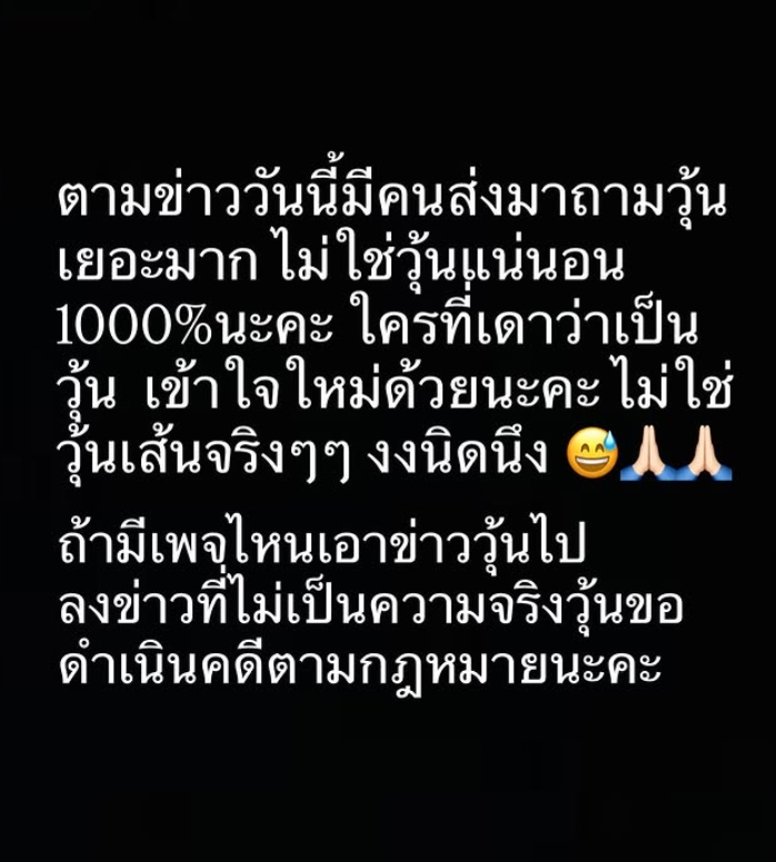 ล่าสุด วุ้นเส้น วิริฒิพา ได้โพสต์ข้อความผ่านไอจีสตอรี่ เป็นการเคลียร์ประเด็นที่เธอถูกโยงถึง โดยมีข้อความระบุว่า “ตามข่าววันนี้ มีคนส่งมาถามวุ้นเยอะมาก ไม่ใช่วุ้นแน่นอน 1000% นะคะ ใครที่เดาว่าเป็นวุ้น เข้าใจใหม่ด้วยนะคะ ไม่ใช่วุ้นเส้นจริงๆๆ งงนิดนึง (อีโมจิยิ้มแห้ง)”