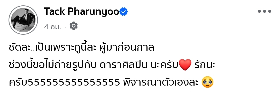 ล่าสุดหนุ่มแทค ทำเอาโซเชียลสะเทือน เมื่อเจ้าตัวโพสต์เฟซบุ๊กยอมรับสภาพว่าเป็น “ผู้มาก่อนกาล” พร้อมแคปชั่นที่ทำเอาแฟนคลับฮากรามค้างว่า “ชัดละ..เป็นเพราะกูนี้ละ ผู้มาก่อนกาล ช่วงนี้ขอไม่ถ่ายรูปกับ ดาราศิลปิน นะครับ รักนะครับครับ 555555555555555 พิจารณาตัวเองละ”