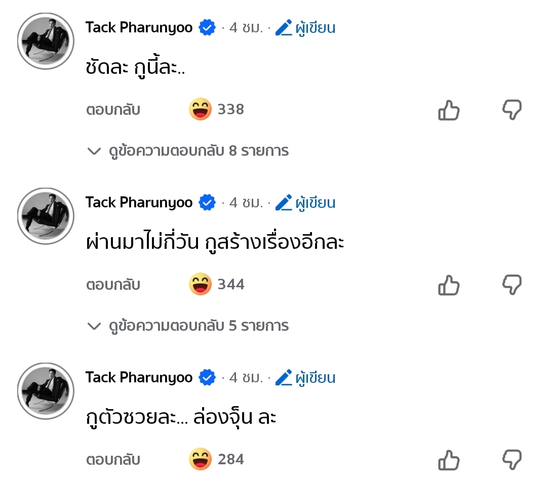 ยังไม่จบแค่นั้น! เจ้าตัวยังตามมาคอมเมนต์ขยี้ตัวเองซ้ำในใต้โพสต์อีกว่า “ผ่านมาไม่กี่วัน กูสร้างเรื่องอีกละ” และ “กูตัวซวยละ… ล่องจุ๊น ละ” (โถ… พ่อคุณเอ๊ย!)