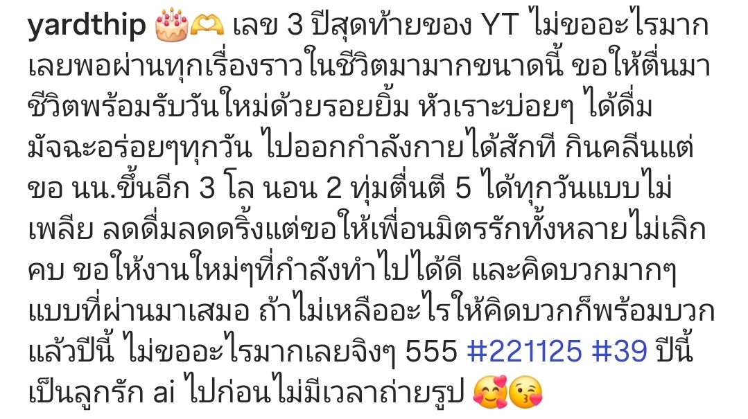 “เลข 3 ปีสุดท้ายของ YT ไม่ขออะไรมาก เลยพอผ่านทุกเรื่องราวในชีวิตมามากขนาดนี้ ขอให้ตื่นมาชีวิตพร้อมรับวันใหม่ด้วยรอยยิ้ม หัวเราะบ่อยๆ ได้ดื่มมัจฉะอร่อยๆทุกวัน ไปออกกำลังกายได้สักที กินคลีนแต่ขอ นน.ขึ้นอีก 3 โล นอน 2 ทุ่มตื่นตี 5 ได้ทุกวันแบบไม่เพลีย”