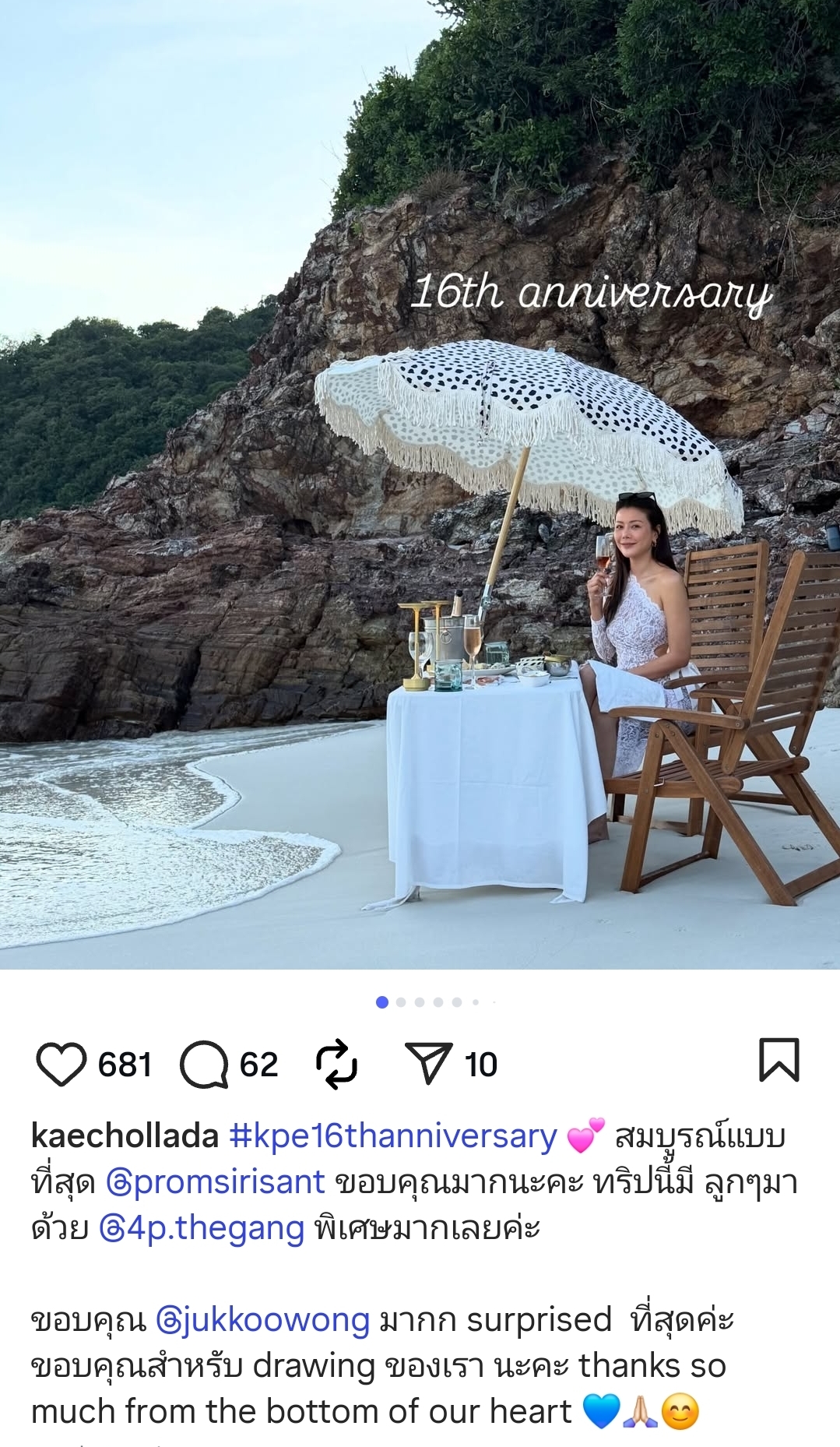 สำหรับทริปฉลองครบรอบ 16 ปี ในครั้งนี้ “เก๋ ชลลดา” ได้เผยภาพสุดโรแมนติกกับสามี “พร้อม สิริสันต์” ขณะนั่งดินเนอร์ชมวิวสวยๆ ริมทะเล ช่างเป็นภาพที่อบอุ่นและชวนฝันสุดๆ แต่ที่ทำให้โมเมนต์นี้พิเศษยิ่งกว่าครั้งไหนๆ คือการมีสมาชิกสุดรักของบ้านมาร่วมเอ็นจอยด้วย นั่นก็คือ “เจ้าลูกๆ สี่ขา” ทั้งสี่ตัว ที่มานั่งเป็นเพื่อนในค่ำคืนสำคัญนี้