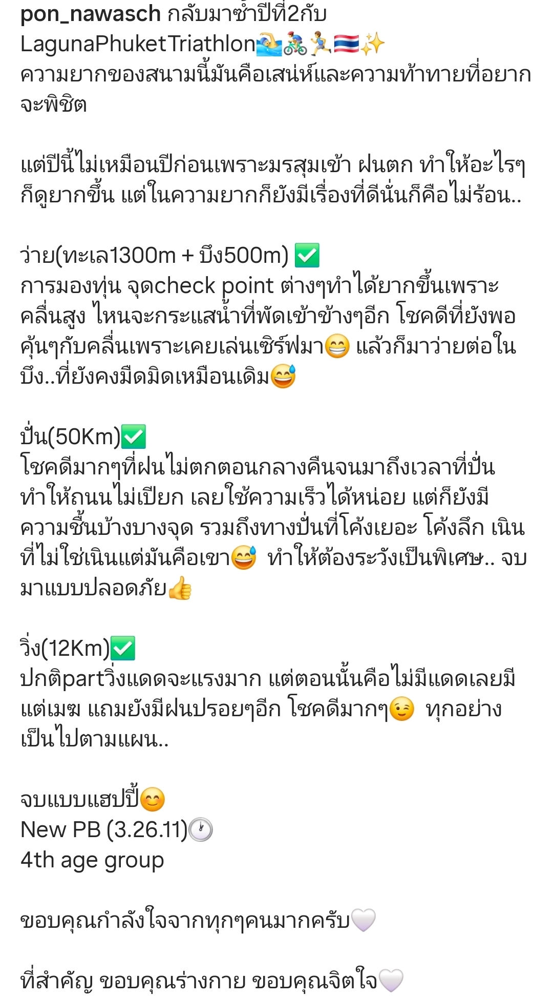 ด้วยการฝึกฝนมาเป็นอย่างดี และกำลังใจจากหวานใจที่อยู่เคียงข้าง ทำให้หนุ่ม “ภณ ณวัสน์” สามารถทำผลงานได้เกินคาด! เขาเข้าเส้นชัยด้วยรอยยิ้มแห่งความสุข พร้อมทำเวลาใหม่ที่ดีที่สุดในชีวิต หรือ New Personal Best (New PB) ด้วยเวลา 3:26:11 ชั่วโมง และคว้าตำแหน่ง 4th age group ไปครองได้อย่างน่าภาคภูมิใจ!