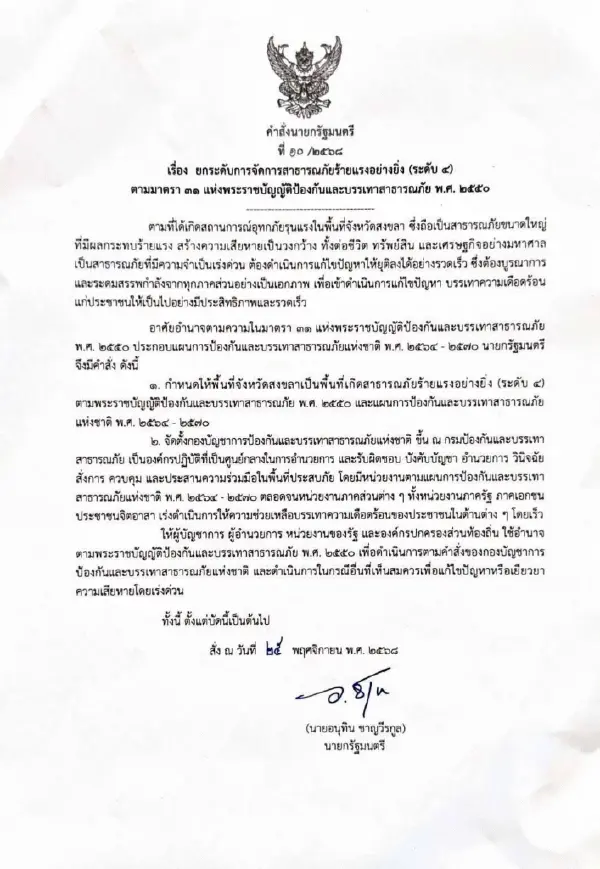 ตามที่ได้เกิดสถานการณ์อุทกภัยรุนแรงในพื้นที่จังหวัดสงขลา โดยเฉพาะอย่างยิ่งที่อำเภอหาดใหญ่ ซึ่งส่งผลกระทบต่อชีวิต ทรัพย์สิน และระบบเศรษฐกิจในวงกว้าง นายอนุทิน ชาญวีรกูล นายกรัฐมนตรี จึงได้ลงนามในคำสั่งสำนักนายกรัฐมนตรี ยกระดับสถานการณ์เป็นภัยพิบัติร้ายแรงอย่างยิ่ง (ระดับ 4) ตามมาตรา ๔๐ แห่งพระราชบัญญัติป้องกันและบรรเทาสาธารณภัย พ.ศ. ๒๕๕๐