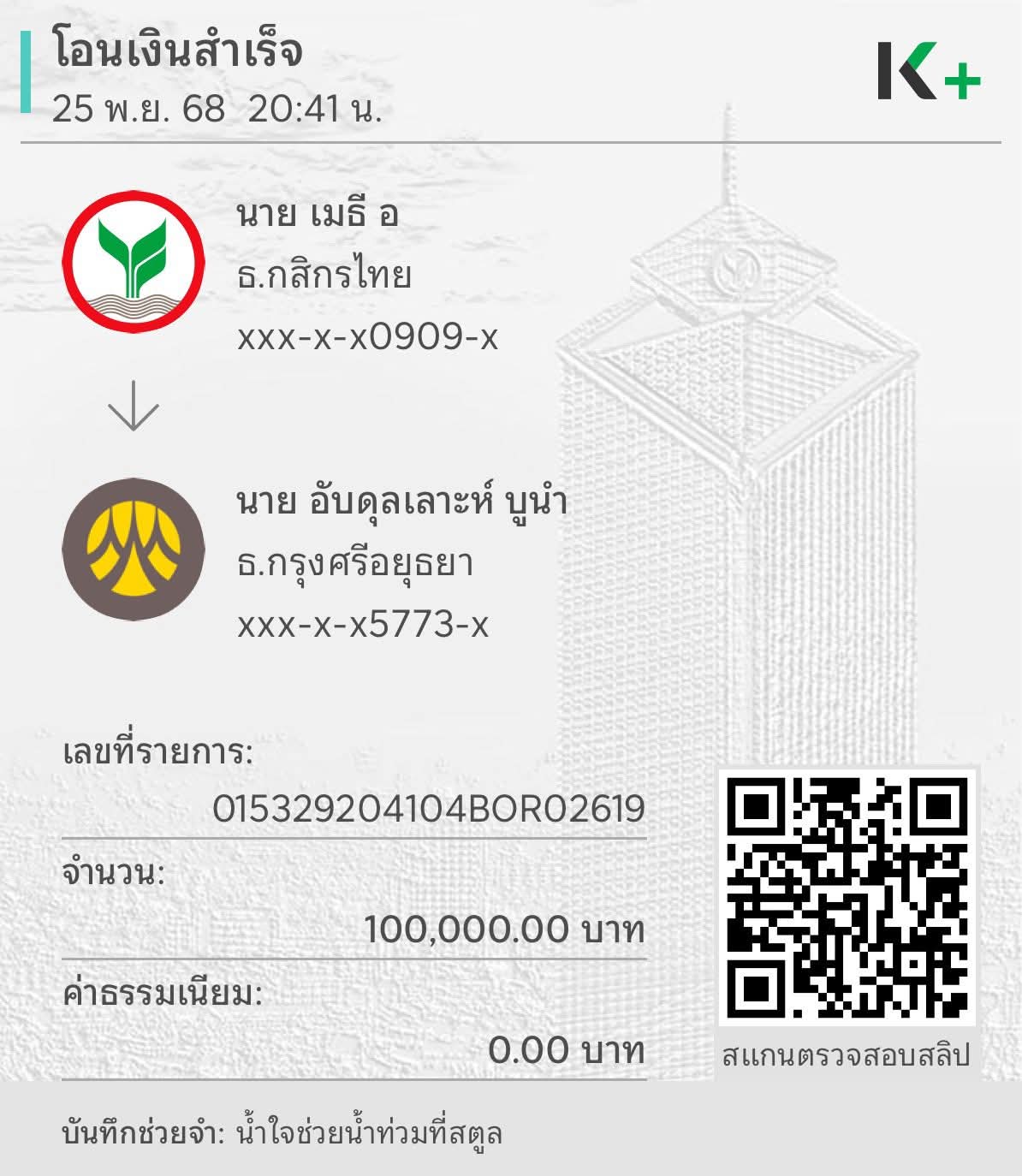 โดยเมื่อช่วงค่ำของวันที่ 25 พฤศจิกายน ที่ผ่านมา เพจเฟซบุ๊ก Metee Labanoon ได้โพสต์ภาพสลิปการโอนเงินจำนวน 100,000 บาท (หนึ่งแสนบาทถ้วน) มอบให้กับ “น้องดีน สตูลอัพเดท” (นายอับดุลเลาะห์) เพื่อเป็นตัวแทนนำไปช่วยเหลือชาวบ้านที่กำลังเดือดร้อน