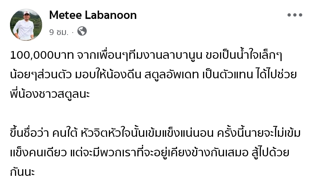 “100,000 บาท จากเพื่อนๆ ทีมงานลาบานูน ขอเป็นน้ำใจเล็กๆ น้อยๆ ส่วนตัว มอบให้น้องดีน สตูลอัพเดท เป็นตัวแทน ได้ไปช่วยพี่น้องชาวสตูลนะ”