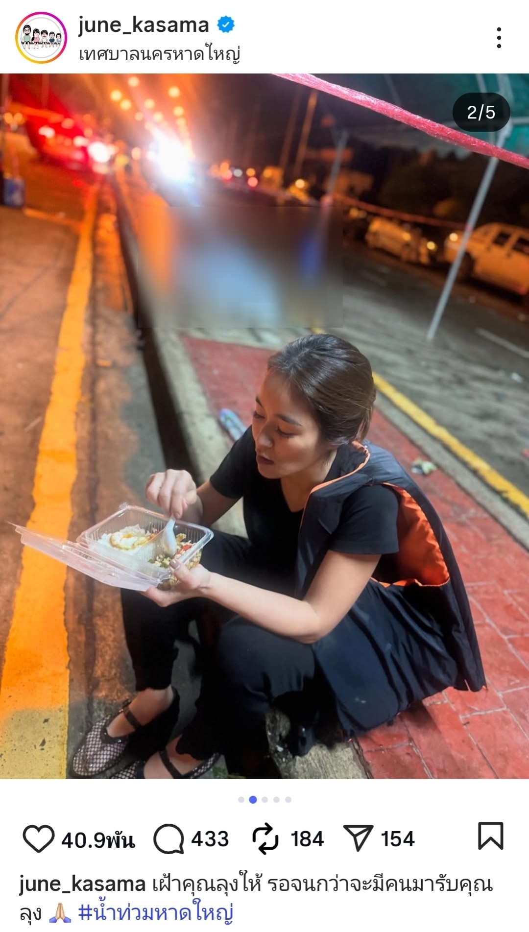 และล่าสุดวันนี้ (27 พ.ย. 68) จูน กษมา ได้สร้างความประทับใจและความสะเทือนใจให้กับผู้ติดตามและชาวโซเชียล เมื่อเธอได้เผยภาพภารกิจที่บีบหัวใจที่สุดลงในเพจเฟซบุ๊กส่วนตัว เป็นภาพที่เจ้าตัวกำลังนั่งเฝ้าร่างไร้วิญญาณของคุณลุงท่านหนึ่ง ซึ่งเสียชีวิตจากเหตุการณ์มหาอุทกภัยในพื้นที่หาดใหญ่เมื่อคืนที่ผ่านมา