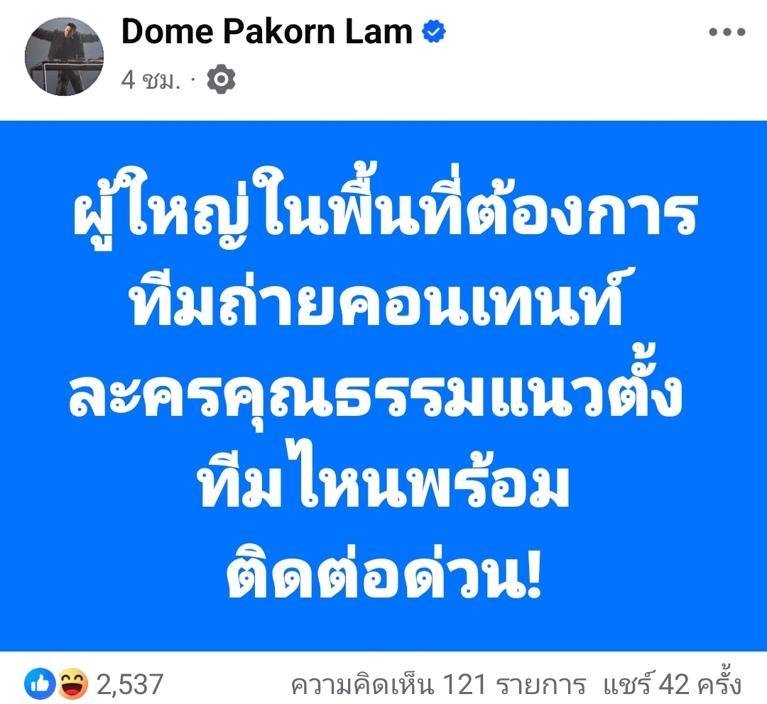 ​นอกจากนี้ ยังมีอีกโพสต์ที่โดมได้แชร์มาเพื่อสื่อสารในทำนองเดียวกัน โดยระบุว่า “ผู้ใหญ่ในพื้นที่ต้องการทีมถ่ายคอนเทนต์ ละครคุณธรรมแนวตั้ง ทีมไหนพร้อม ติดต่อด่วน!” ทำให้โพสต์ดังกล่าวถูกแชร์และได้รับความสนใจจากชาวเน็ตจำนวนมาก