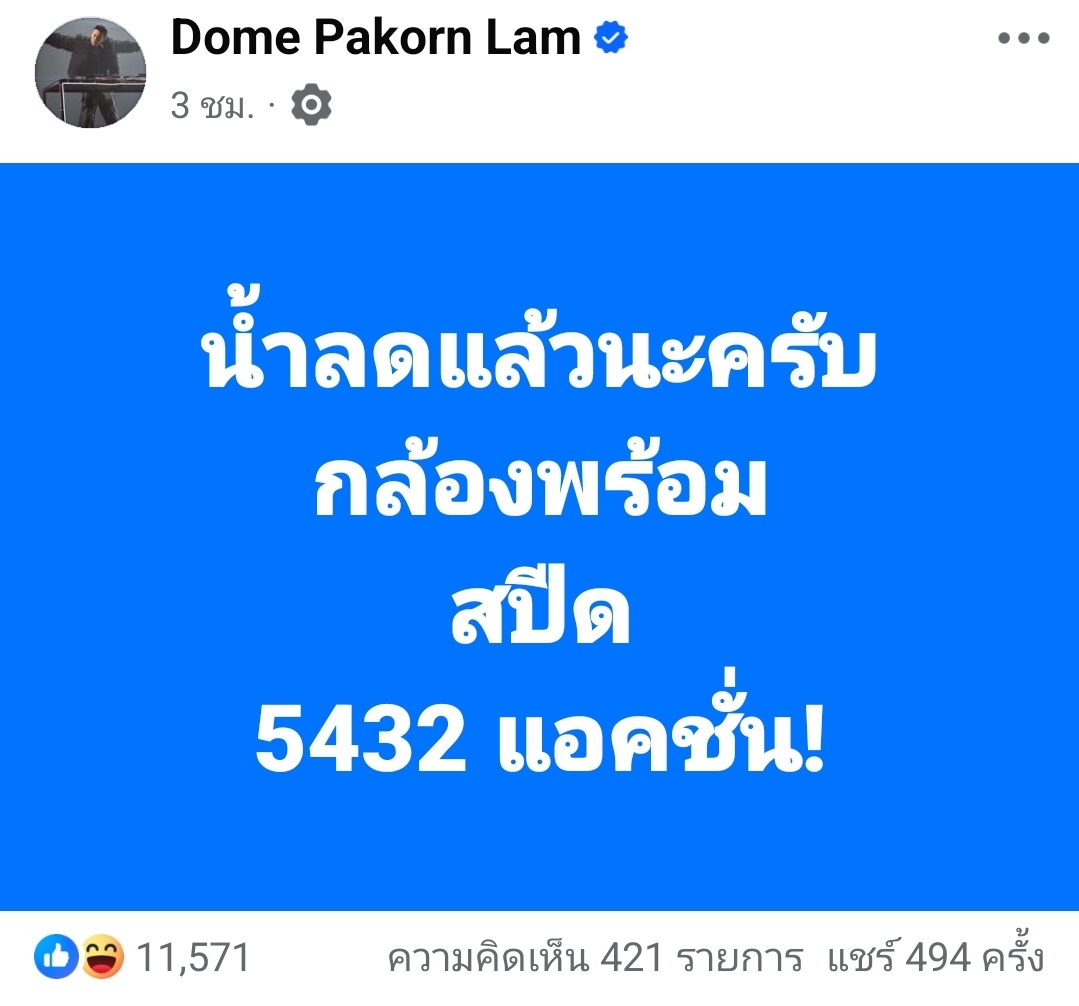 โดยระบุว่า “น้ำลดแล้วนะครับ กล้องพร้อม สปีด 5432 แอคชั่น!” ซึ่งถูกตีความว่าเป็นการ “แซะ” บรรดาผู้ใหญ่หรือผู้มีอำนาจที่มักจะปรากฏตัวเพื่อถ่ายทำคอนเทนต์หรือถ่ายรูปแสดงผลงานทันทีที่สถานการณ์วิกฤตคลี่คลายลง ทั้งที่ก่อนหน้าไม่ได้เข้ามาดูแลอย่างจริงจัง