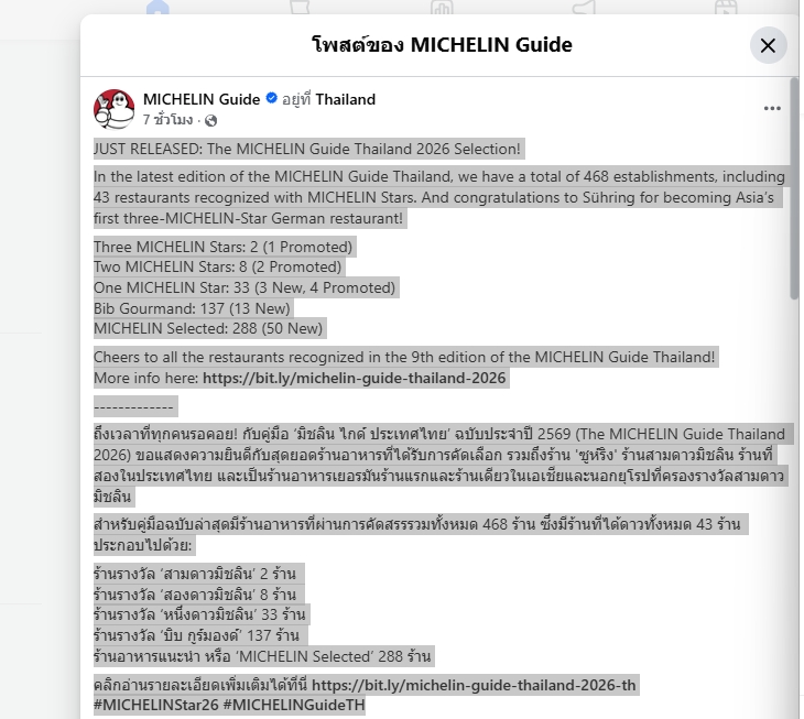 เฟสบุ๊กเพจ ‘MICHELIN Guide’ที่มีผู้ติดตามกว่า 7.6 แสนคน ได้ออกมาโพสต์ข้อความ ประกาศคู่มือมิชลิน ไกด์ ประเทศไทย ฉบับประจำปี 2569 (The MICHELIN Guide Thailand 2026) มีร้านอาหารที่ผ่านการคัดสรรรวมทั้งหมด 468 ร้าน ซึ่งมีร้านที่ได้ดาวทั้งหมด 43 ร้าน ประกอบไปด้วย : ร้านรางวัล สามดาวมิชลิน 2 ร้าน , ร้านรางวัล สองดาวมิชลิน 8 ร้าน  , ร้านรางวัล หนึ่งดาวมิชลิน 33 ร้าน ร้านรางวัล บิบ กูร์มองด์ 137 ร้าน  ร้านอาหารแนะนำ หรือ MICHELIN Selected 288 ร้าน