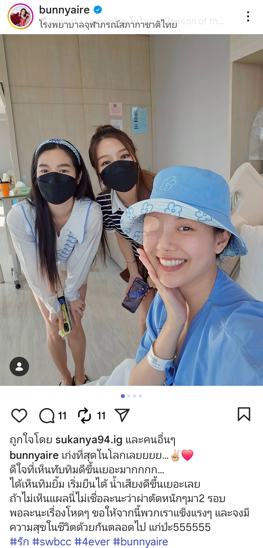 ​โดยมีข้อความที่ ทับทิม เขียนบรรยายใต้ภาพว่า “ถ้าไม่เห็นแผลนี่ไม่เชื่อละนะว่าผ่าตัดหนักๆมา 2 รอบ พอละนะเรื่องโหดๆ ขอให้จากนี้พวกเราแข็งแรงๆ…” แสดงให้เห็นถึงความตั้งใจที่จะกลับมาใช้ชีวิตอย่างมีความสุขและแข็งแรงอีกครั้ง ซึ่งเพื่อนรักอย่าง แอร์ และ เอ้ก ก็พร้อมที่จะเป็นพลังบวกให้เธอผ่านพ้นช่วงเวลานี้ไปได้อย่างสวยงาม ภาพแห่งมิตรภาพที่ส่งต่อกำลังใจนี้จึงเป็นเครื่องยืนยันว่า แก๊งสตรอว์เบอร์รี่ชีสเค้ก ยังคงเป็นสัญลักษณ์ของมิตรภาพที่มั่นคงและแท้จริงในวงการบันเทิงไทย! ขอเป็นกำลังใจให้ ทับทิม หายไวๆ นะคะ!