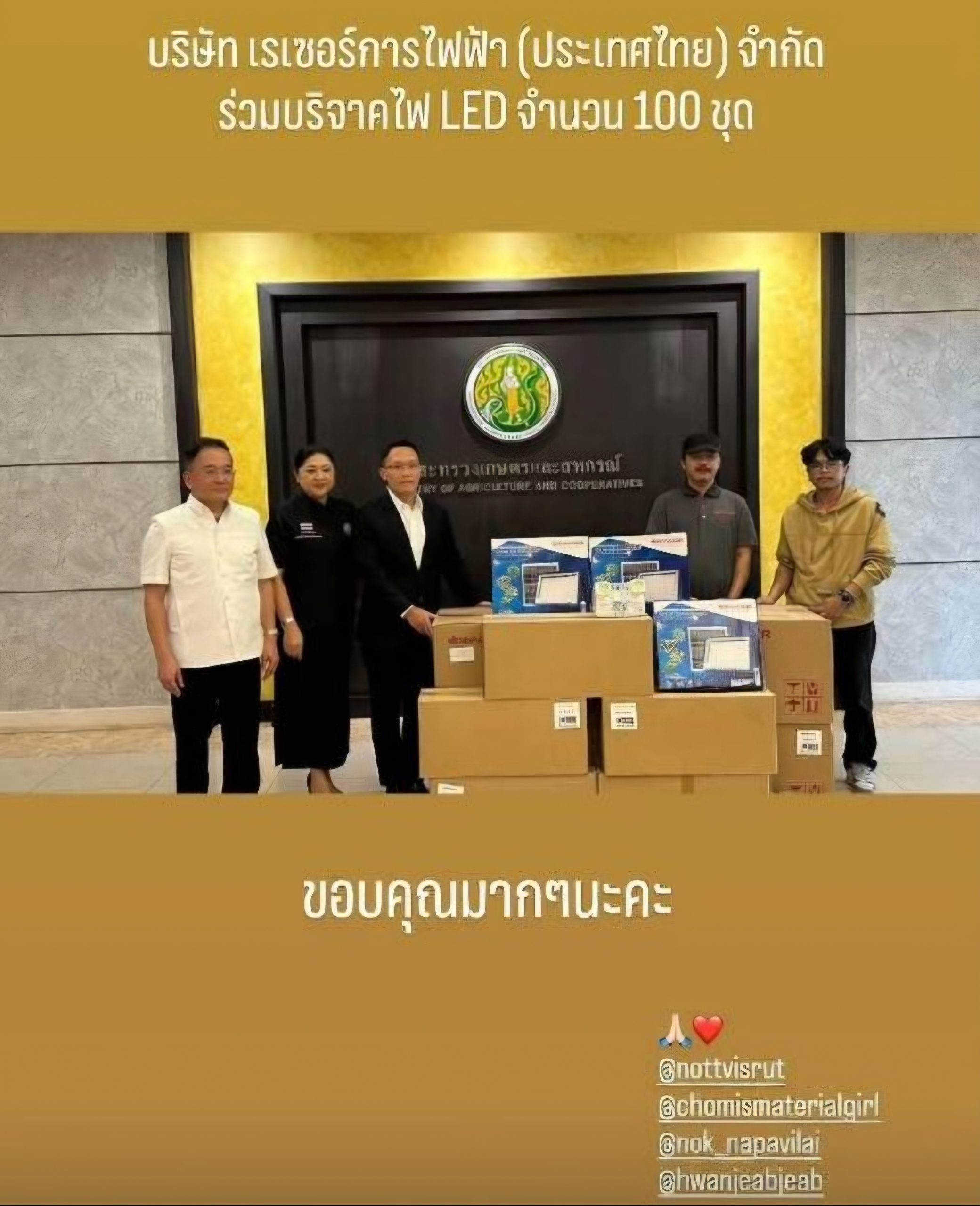 ล่าสุด ทางด้านสามีสุดหล่อ น็อต วิศรุต รังษีสิงห์พิพัฒน์ ก็ได้เดินหน้าผนึกกำลังช่วยพื้นที่ประสบภัยต่อ โดยบริจาคในนาม บริษัท เรเซอร์การไฟฟ้า (ประเทศไทย) จำกัด มอบอุปกรณ์สำคัญที่จำเป็นอย่างยิ่งหลังน้ำลด นั่นคือ โคมไฟโซลาร์เซลล์ จำนวน 50 โคม และ โคมไฟฉุกเฉิน จำนวน 50 โคม รวมทั้งสิ้น 100 ชุด ให้กับทาง กระทรวงเกษตรและสหกรณ์