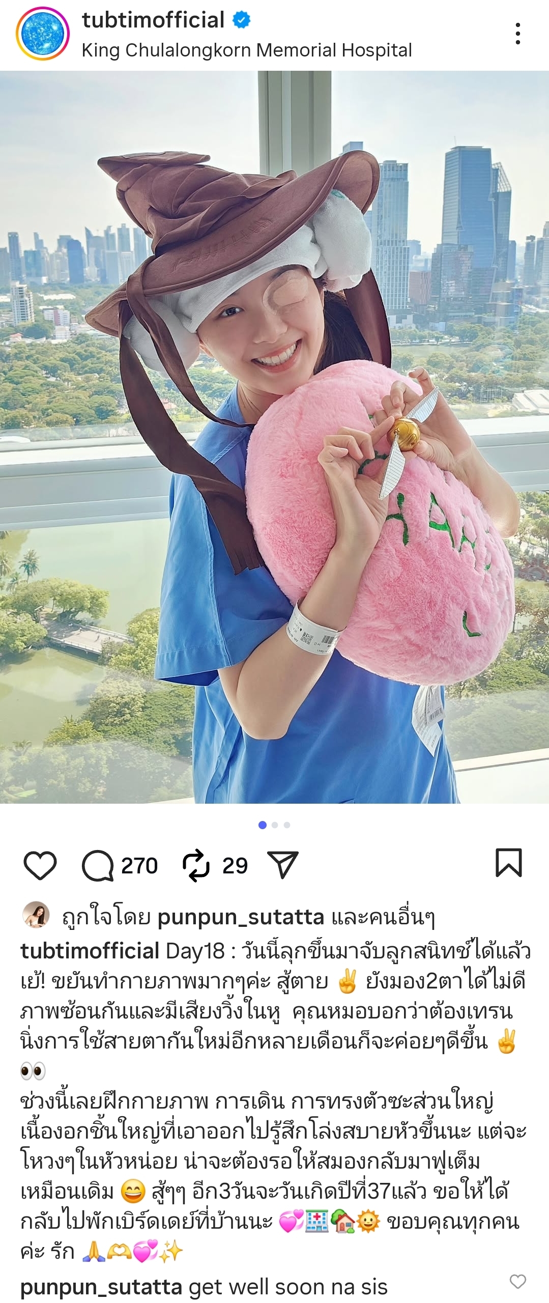ยังคงเป็นกำลังใจสำคัญให้กับแฟน ๆ และคนใกล้ชิด สำหรับยูทูบเบอร์และอดีตพิธีกรสาวมากความสามารถ ทับทิม มัลลิกา จงวัฒนา ที่ต้องเข้ารับการผ่าตัดเนื้องอกในสมองเป็นครั้งที่ 2 ซึ่งล่าสุดวันนี้ (28 พ.ย. 68) เจ้าตัวได้ออกมาอัปเดตอาการหลังการผ่าตัดผ่านอินสตาแกรมส่วนตัว เผยให้เห็นรอยยิ้มสดใส และความมุ่งมั่นในการฟื้นฟูร่างกาย