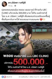 จากสถานการณ์น้ำท่วมรุนแรงในพื้นที่ภาคใต้ที่ส่งผลกระทบเป็นวงกว้าง หลายชุมชนถูกตัดขาด บ้านเรือนเสียหาย และประชาชนจำนวนมากยังคงต้องการความช่วยเหลืออย่างเร่งด่วน ล่าสุด “พลอย เฌอมาลย์ บุญยศักดิ์” ร่วมกับ LBC CLINIC ได้ร่วมมอบเงินบริจาคเป็นจำนวน 500,000 บาท ผ่านองค์กรทำดี ของพิธีกรมากความสามารถ “บุ๋ม ปนัดดา วงศ์ผู้ดี” เพื่อสมทบทุนฟื้นฟูพื้นที่ประสบภัย และช่วยเหลือครอบครัวที่ได้รับผลกระทบโดยตรง
