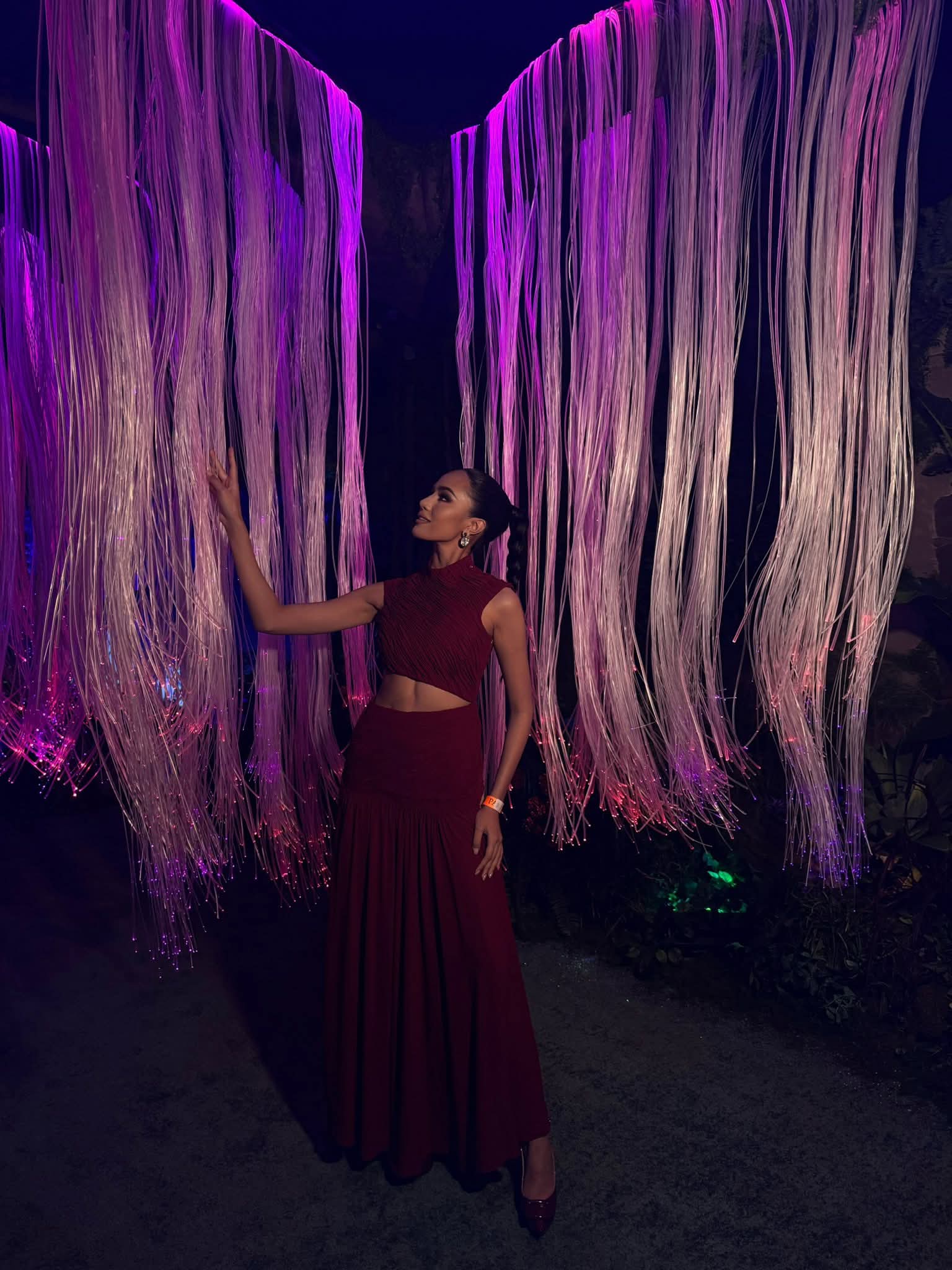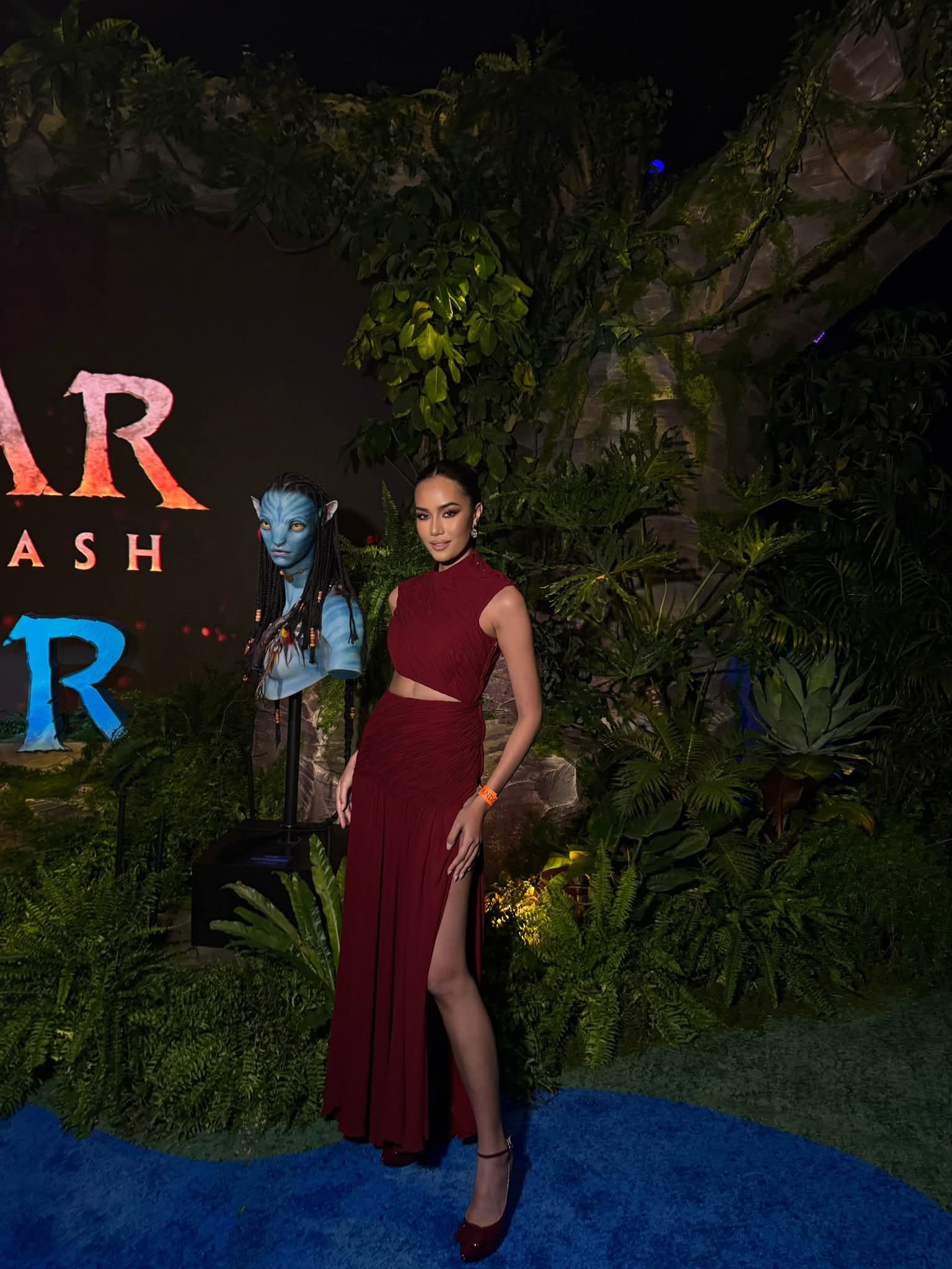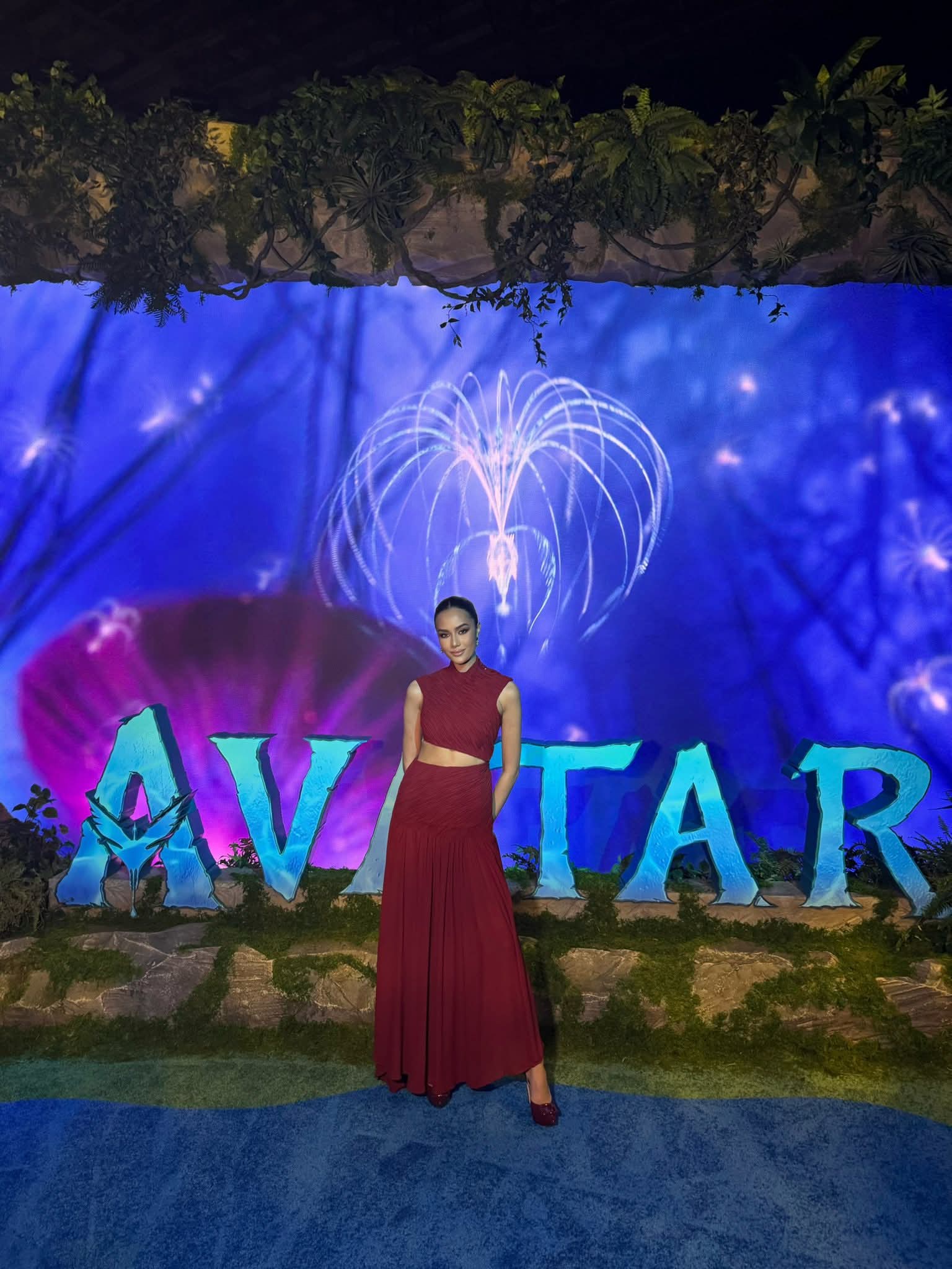 งานนี้ “โอปอล” มาในชุดราตรีสีแดงเลือดหมู ดีไซน์เก๋โชว์เอวเอส ขับผิวให้ดูผ่องมีออร่า ซึ่งดูเหมือนจะตั้งใจแต่งมาให้เข้ากับคอนเซปต์ภาคใหม่ “Fire and Ash” (ไฟและเถ้าถ่าน) ตัดกับบรรยากาศแสงสีน้ำเงินและฉากสุดอลังการของดาวแพนดอร่าได้อย่างลงตัวที่สุด