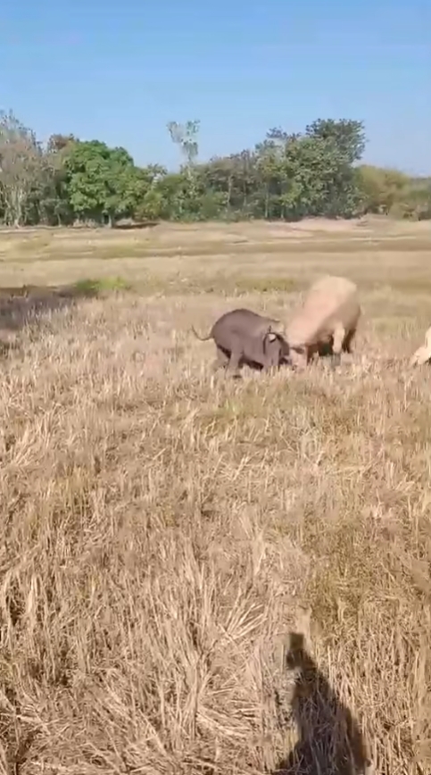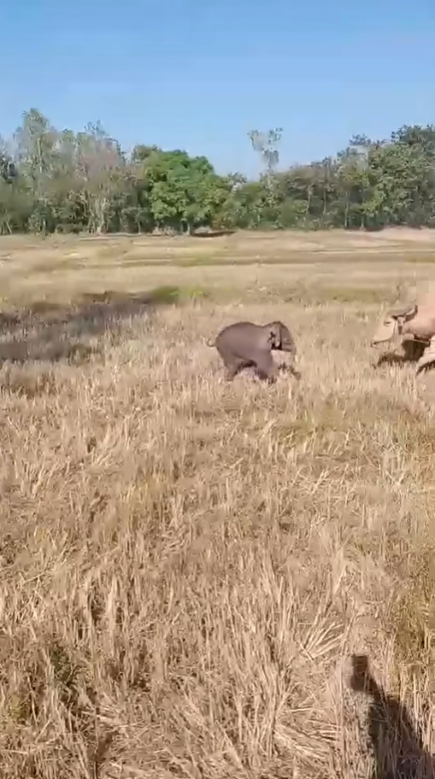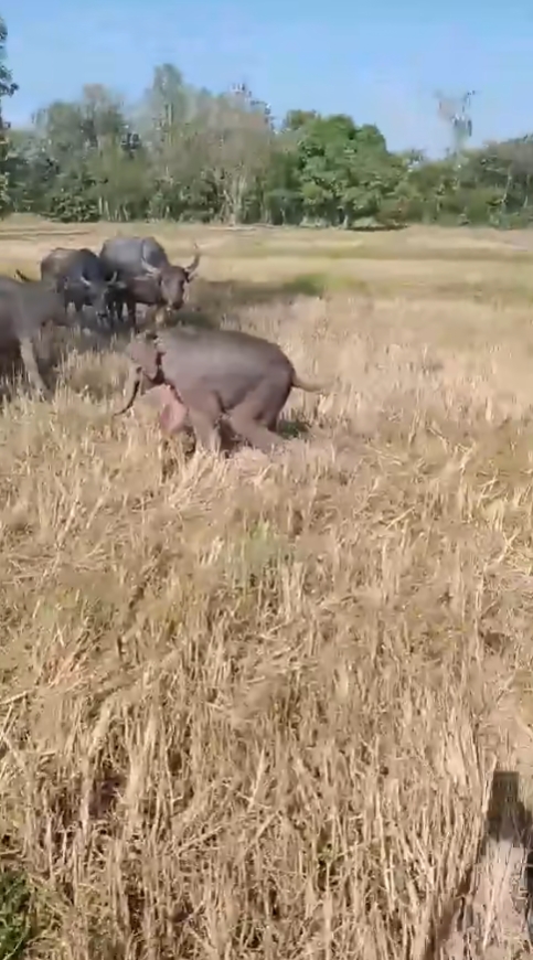 โดยในเหตุการณ์เผยให้เห็นว่า “ลูกช้างป่า” ตัวหนึ่งพลัดหลงจากโขลง ไม่ทราบต้นทาง และลูกช้างได้วิ่งเข้าไปในทุ่งนาที่มีควายเผือกที่ชาวบ้านนำมาเลี้ยงไว้ในทุ่งนา จึงเกิดเหตุปะทะกัน  แต่ควายเผือกตัวใหญ่ได้วิ่งเข้าขวิดใส่ลำตัวของลูกช้างอย่างแรงจนลูกช้างกระเด็น ทำให้ลูกช้างได้รับบาดเจ็บเล็กน้อยบริเวณลำคอและก้น แต่ยังสามารถเคลื่อนไหวได้ตามปกติ