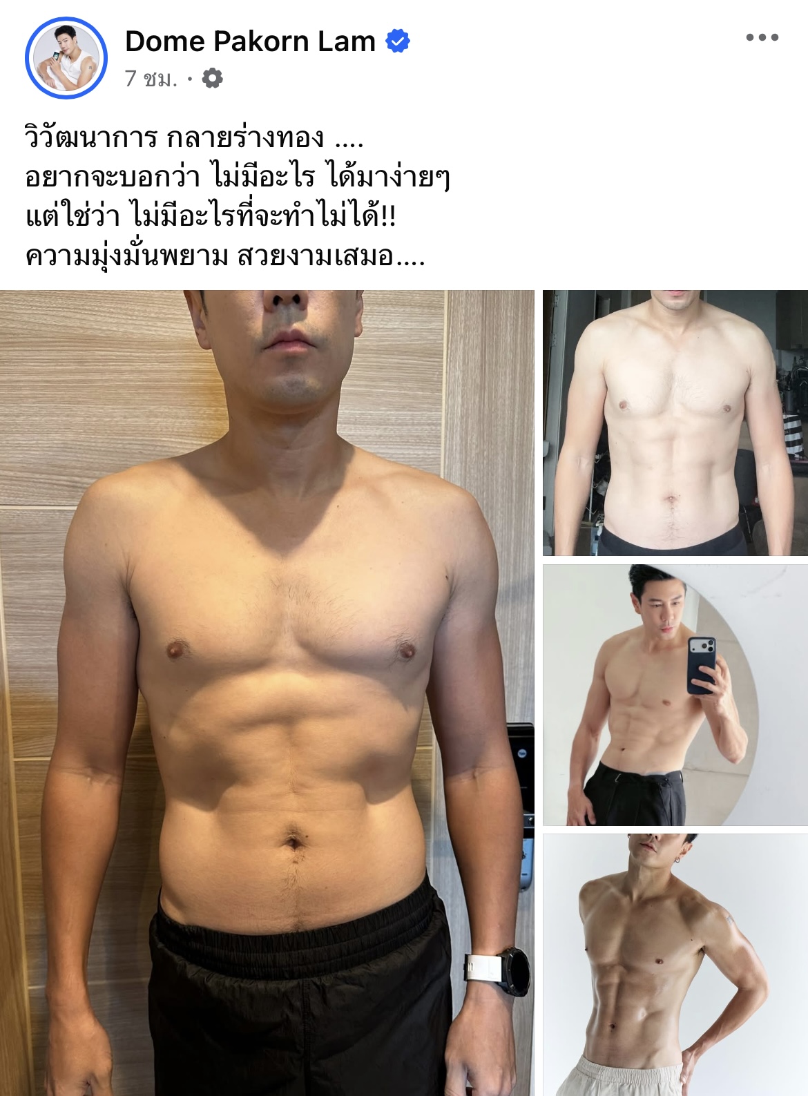 ทำเอาโซเชียลฮือฮาอีกครั้ง เมื่อหนุ่มหล่อหน้าอมตะ โดม ปกรณ์ ลัม ออกมาโพสต์โชว์ “วิวัฒนาการร่างทอง” แบบจัดเต็มผ่านเฟซบุ๊กส่วนตัว เผยภาพก่อน–หลังฟิตหุ่นที่เห็นชัดทุกสัดส่วน ตั้งแต่ช่วงลำตัว หน้าท้อง ไปจนถึงซิกซ์แพ็กสุดแน่น ที่พัฒนาขึ้นอย่างต่อเนื่องแบบเห็นผลจริง