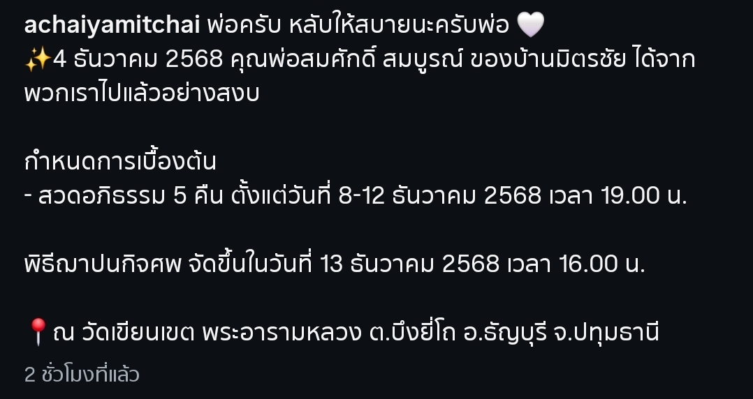 โดย “เอ ไชยา” ได้โพสต์ข้อความสุดซึ้งถึงคุณพ่อว่า “พ่อครับ หลับให้สบายนะครับพ่อ… คุณพ่อสมศักดิ์ สมบูรณ์ ของบ้านมิตรชัย ได้จากพวกเราไปแล้วอย่างสงบ” พร้อมเผยกำหนดการบำเพ็ญกุศล เพื่อให้ญาติมิตรและแฟนคลับได้มาร่วมไว้อาลัยเป็นครั้งสุดท้าย