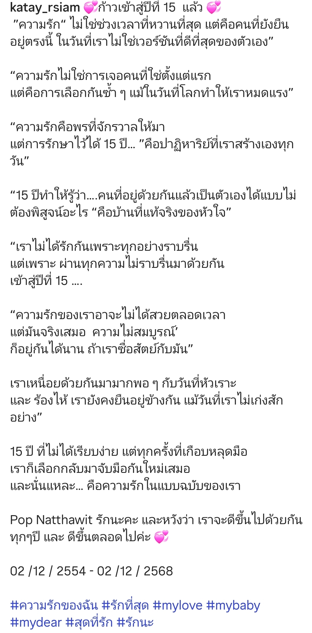 “เราเหนื่อยด้วยกันมามากพอๆ กับวันที่หัวเราะและร้องไห้ เรายังคงยืนอยู่ข้างกัน แม้วันที่เราไม่เก่งสักอย่าง” และประโยคสุดท้ายที่กินใจที่สุดคือ “15 ปี ที่ไม่ได้เรียบง่าย แต่ทุกครั้งที่เกือบหลุดมือเราก็เลือกกลับมาจับมือกันใหม่เสมอและนั่นแหละ…คือความรักในแบบฉบับของเรา Pop Natthawit รักนะคะ และหวังว่า เราจะดีขึ้นไปด้วยกันทุกๆ ปีและดีขึ้นตลอดไปค่ะ” พร้อมทิ้งท้ายวันครบรอบตั้งแต่วันที่ 02/12/2554 ถึง 02/12/2568