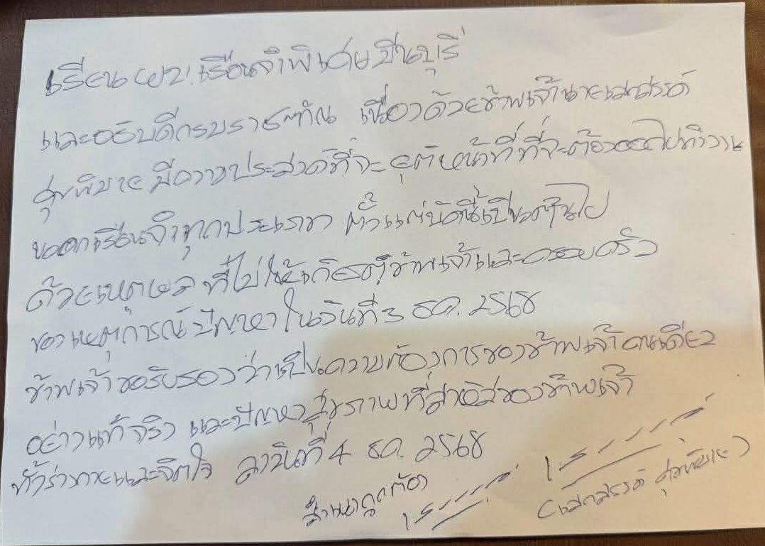 “ด้วยเหตุผลที่ไม่ให้เกียรติข้าพเจ้าและครอบครัว จากเหตุการณ์ปัญหาในวันที่ 3 ธ.ค. 2568 ข้าพเจ้าขอรับรองว่าเป็นความต้องการของข้าพเจ้าคนเดียวอย่างแท้จริง และปัญหาสุขภาพที่สาหัส ทั้งร่างกายและจิตใจ”