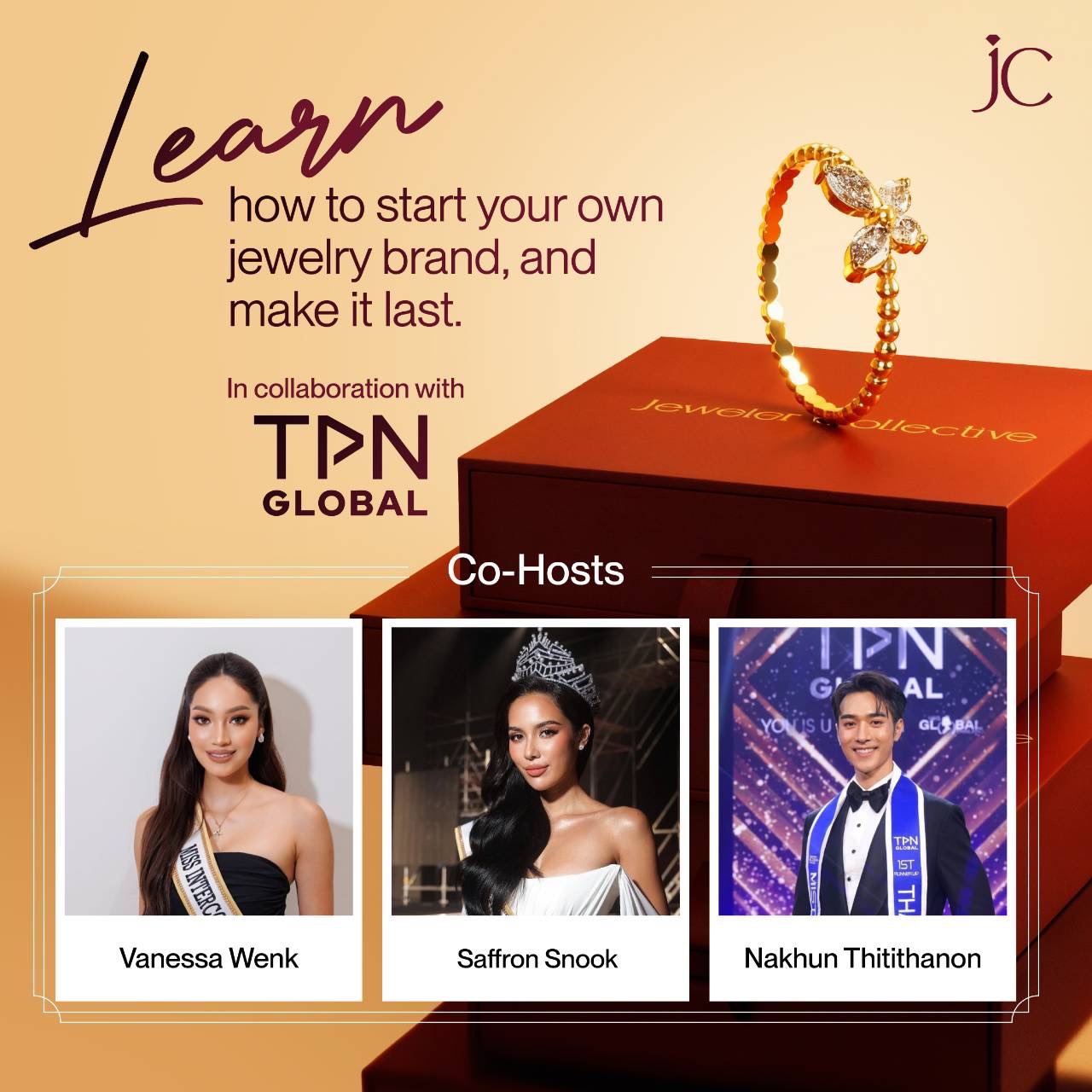 เตรียมเสียงกรี๊ดให้คอแตกกันไปเลย เมื่อบ้าน TPN Global ขนทัพหนุ่มหล่อสาวสวยระดับมงลงมารวมตัวกันในงานเดียว นำทีมโดย ซาฟรอน สนุก เจ้าของตำแหน่ง Mrs. Global Thailand 2025 ประชันความปังกับ วาเนสซา เวนก์ Miss Intercontinental Thailand และหนุ่มหล่อละมุน ณคุณ ฐิติฐานนท์ Mister Global Thailand 1st Runner Up 2025 ที่คราวนี้ไม่ได้มาเดินสับบนรันเวย์ แต่จะมารับบทบาทสุดท้าทายในฐานะ Co-Host สำหรับเวิร์กช็อปสุดพิเศษ How to Start Your Own Jewelry Brand, and Make it Last งานนี้ JC Studio ภายใต้ Jeweler Collective จับมือกับ TPN Global เปิดโอกาสทองให้คนที่ฝันอยากเป็นเจ้าของแบรนด์เครื่องประดับได้มาเรียนรู้กันแบบเจาะลึกถึงกึ๋น