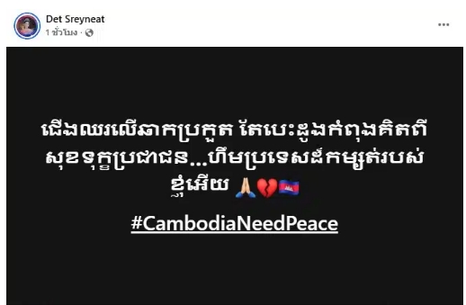 “ในฐานะพลเมืองกัมพูชา ฉันไม่สามารถนิ่งเฉยได้อีกต่อไป ในขณะที่ประเทศของฉันยังคงถูกกระทำย่ำยีจากเพื่อนบ้านที่เปิดฉากโจมตีเราก่อนซ้ำแล้วซ้ำเล่า