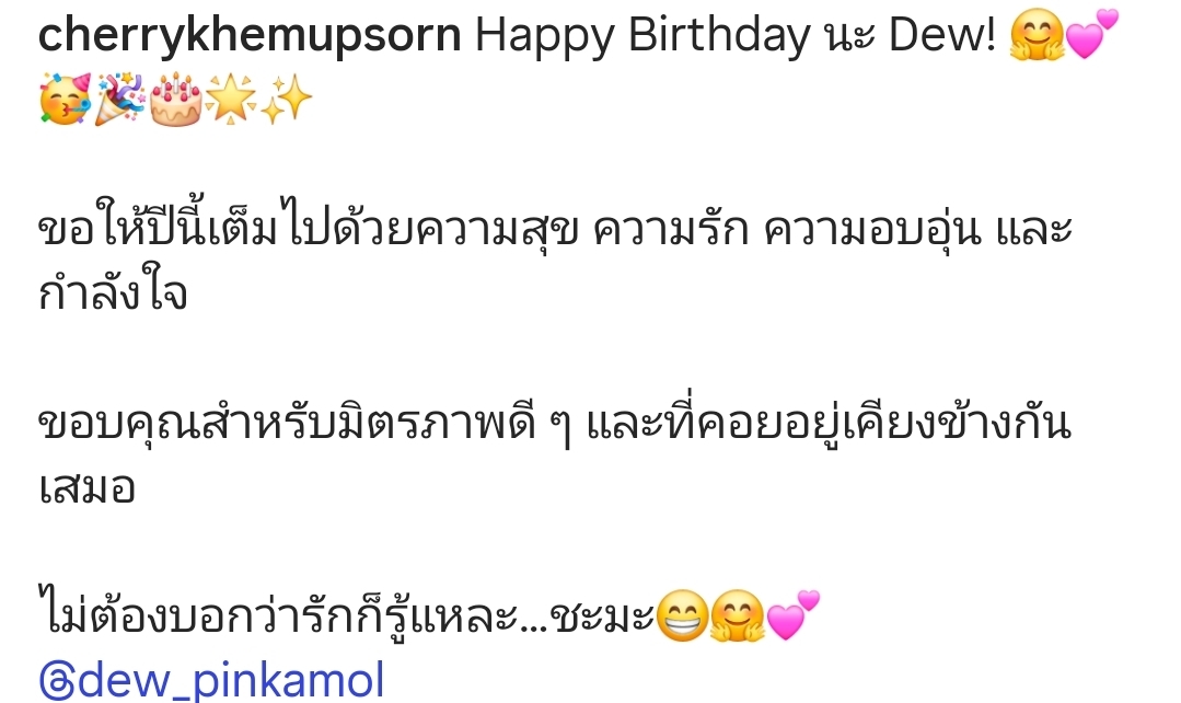 ”Happy Birthday นะ Dew! 🤗💕🥳🎉🎂🌟✨ ขอให้ปีนี้เต็มไปด้วยความสุข ความรัก ความอบอุ่น และกำลังใจ ขอบคุณสำหรับมิตรภาพดี ๆ และที่คอยอยู่เคียงข้างกันเสมอ ไม่ต้องบอกว่ารักก็รู้แหละ…ชะมะ😁🤗💕 @dew_pinkamol”