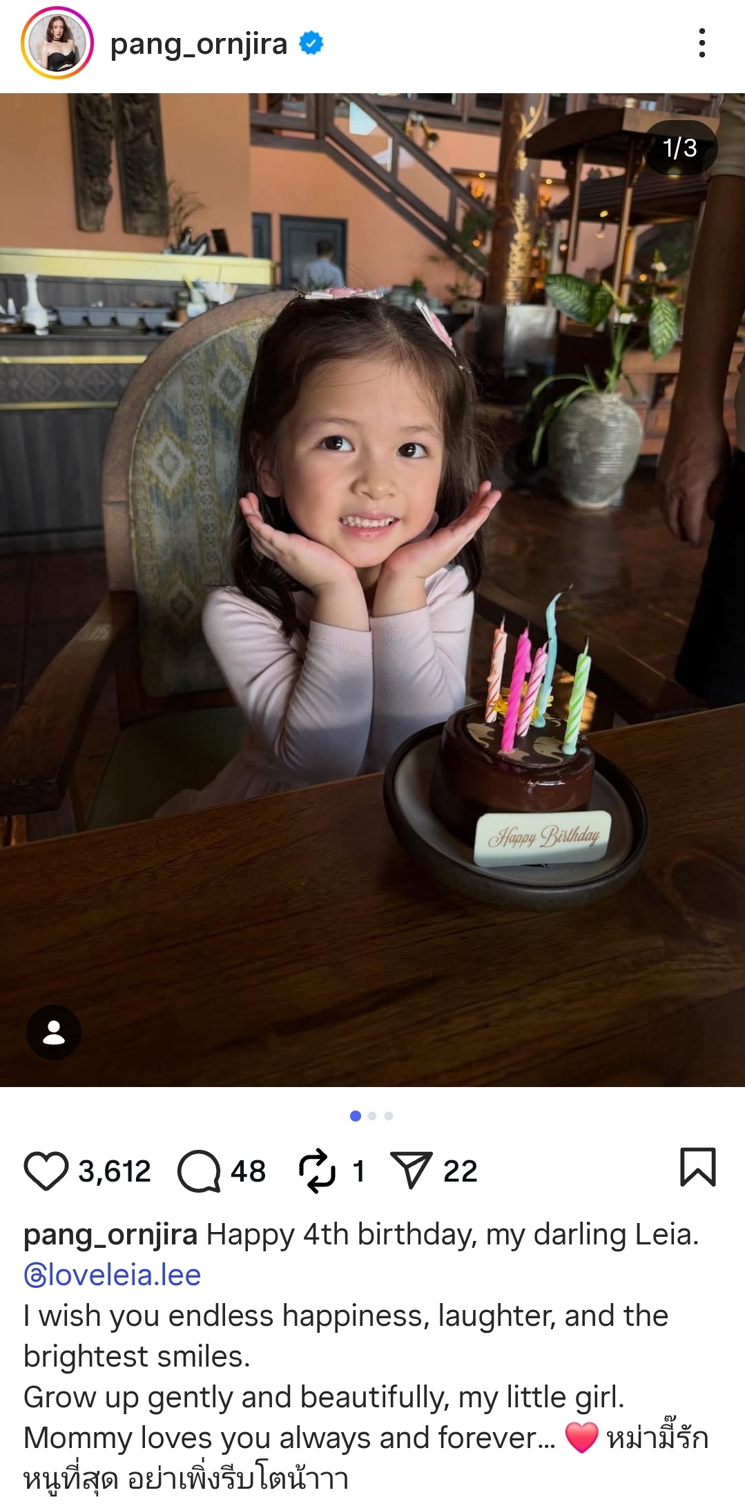 ”Happy 4th birthday, my darling Leia. I wish you endless happiness, laughter, and the brightest smiles. Grow up gently and beautifully, my little girl. Mommy loves you always and forever…❤️ หม่ามี๊รักหนูที่สุด อย่าเพิ่งรีบโตน้าาา”