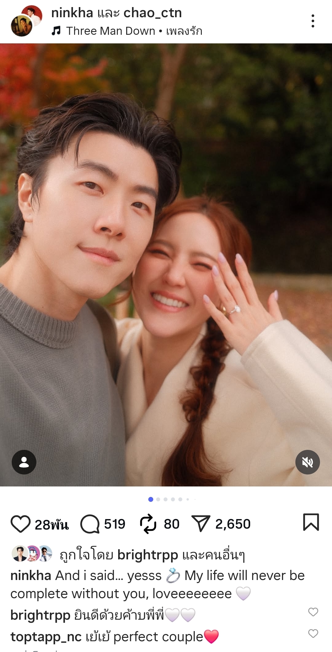 หลังจากนั้นไม่นาน ทางด้านแฟนสาวก็ไม่รอช้า ได้ออกมาโพสต์ภาพแหวนเพชรสุดหรูเม็ดโตที่เปล่งประกายอยู่บนนิ้วนางข้างซ้าย พร้อมกับแคปชั่นภาษาอังกฤษสุดซึ้งที่ตอบรับคำขอแต่งงานอย่างชัดเจนว่า “i said… yesss My life will never be complete without you, loveeeeeeee” (ฉันพูดว่า… ใช่แล้ว ชีวิตฉันจะไม่มีวันสมบูรณ์ถ้าไม่มีคุณ รักกกกก) ซึ่งเป็นการยืนยันสถานะการเปลี่ยนผ่านจาก “แฟน” สู่ “คู่ชีวิต” อย่างเป็นทางการ