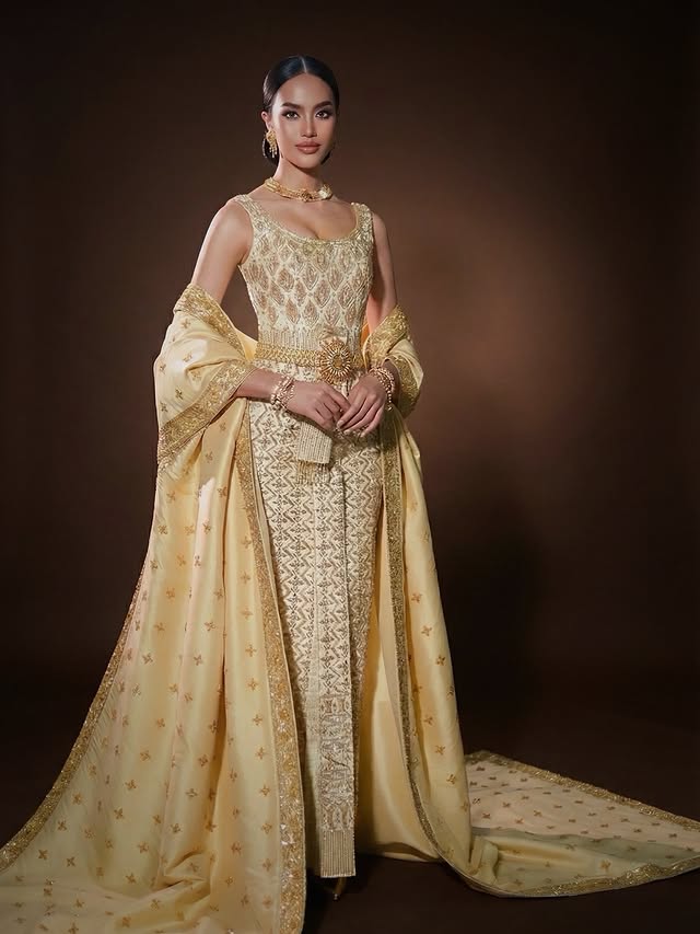 จึงถ่ายทอดออกมาเป็น การไล่เฉดสีทอง–อำพัน–ส้มประกายเพลิง บนผืนผ้าไหมยกดอกลำพูน ก่อนปักทับด้วยดิ้นทองและคริสตัลนับพันเม็ด ทำให้ชุดเปล่งประกายรอบทิศทางราวกับเปลวไฟที่กำลังเคลื่อนไหวเมื่อกระทบแสงไฟในสนาม