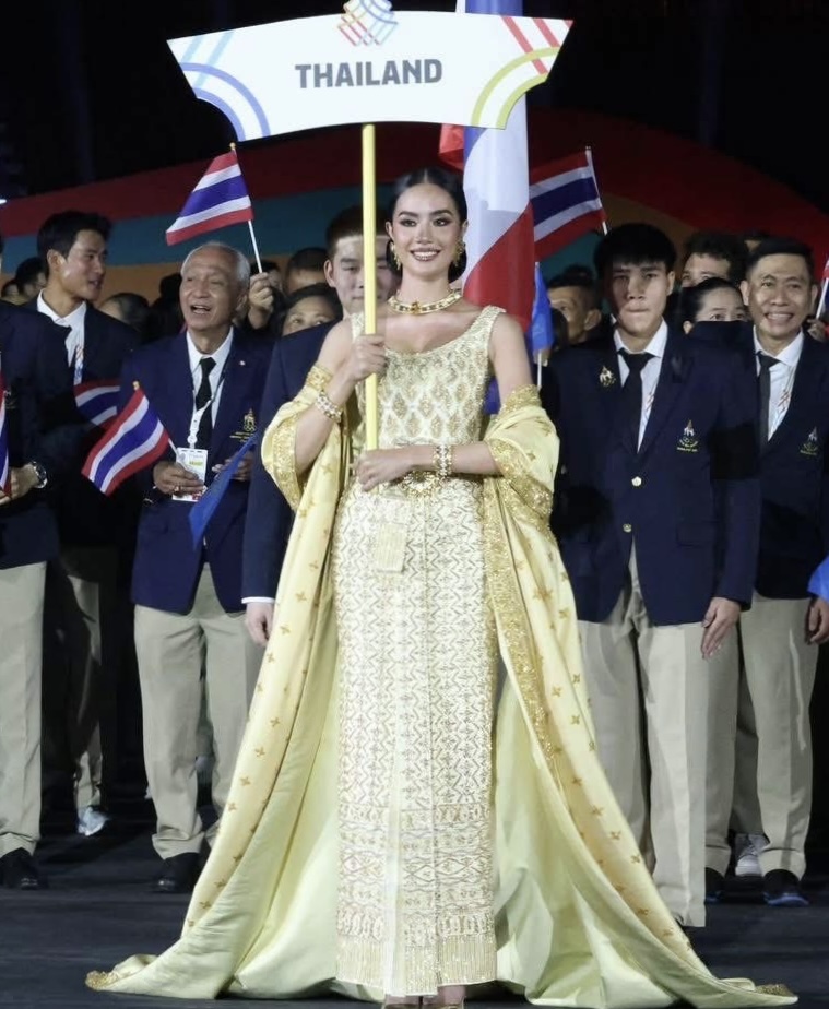 สร้างเสียงฮือฮาไปทั่วราชมังคลากีฬาสถานและโลกออนไลน์ สำหรับโฉมงาม “โอปอล สุชาตา ช่วงศรี” Miss World 2025 และมิสเวิลด์คนแรกของไทย ที่ปรากฏโฉมในลุค “ชุดไทยดุสิตสีทองอร่าม” ขณะถือป้าย THAILAND นำทัพนักกีฬาไทยเข้าสู่สนามในพิธีเปิดกีฬาซีเกมส์ ครั้งที่ 33 เมื่อคืนวันที่ 9 ธันวาคม 2568