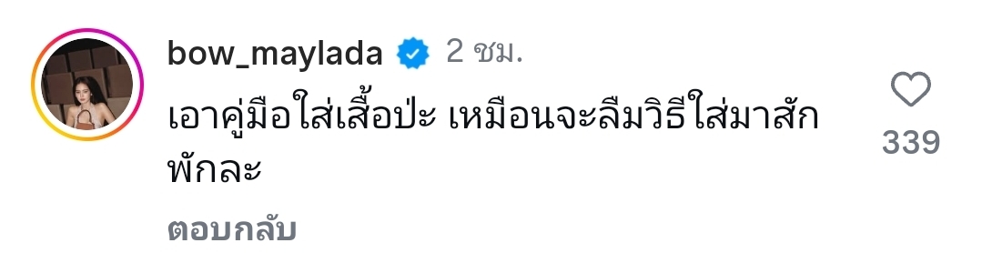 แต่ที่เรียกเสียงฮาและเป็นที่พูดถึงที่สุดคงหนีไม่พ้นคอมเมนต์จาก “เจ้าของตัวจริง” อย่างนางเอกสาวสุดสวย “โบว์ เมลดา” ที่รีบเข้ามาคุมสถานการณ์ความฮอตเกินอัตราของแฟนหนุ่มทันที โดยโบว์ได้พิมพ์คอมเมนต์แซวอย่างน่ารักแต่เด็ดขาดว่า “เอาคู่มือใส่เสื้อป้ะ เหมือนจะลืมวิธีใส่มาสักพักละ” พร้อมอิโมจิขำขัน