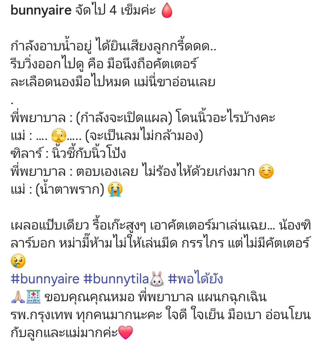 ​แอร์เล่าต่อว่า แม้ในช่วงที่พยาบาลกำลังจะเปิดแผลถามว่าโดนอะไรบ้าง ตัวเธอเองก็แทบจะเป็นลม ไม่กล้ามอง แต่ที่น่าตกใจคือ น้องฑิลาร์ ลูกสาวที่บาดเจ็บ กลับตอบคำถามพยาบาลได้เองว่า “นิ้วชี้กับนิ้วโป้ง” และที่สำคัญคือ ไม่ร้องไห้เลย ทำให้พยาบาลถึงกับชมว่า “เก่งมาก” ซึ่งเหตุการณ์นี้ทำเอาคุณแม่น้ำตาท่วมใจแต่ก็ภูมิใจในความเข้มแข็งของลูกสาวมาก