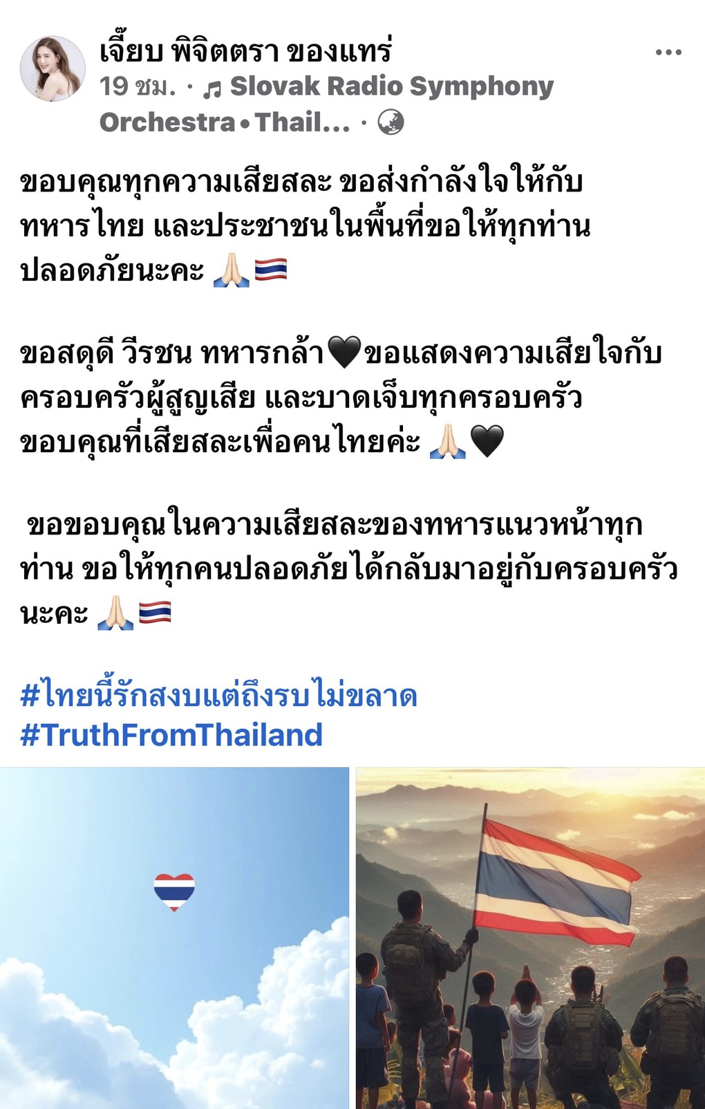 “เจี๊ยบ พิจิตตรา” ได้โพสต์ข้อความผ่านโซเชียลมีเดีย ส่งต่อพลังใจให้กับ ทหารไทย ผู้ปฏิบัติหน้าที่แนวหน้า และประชาชนที่ได้รับผลกระทบจากสถานการณ์ความไม่สงบในพื้นที่ โดยเจ้าตัวได้กล่าวขอบคุณในความเสียสละอันยิ่งใหญ่และอวยพรให้ทุกคนปลอดภัย