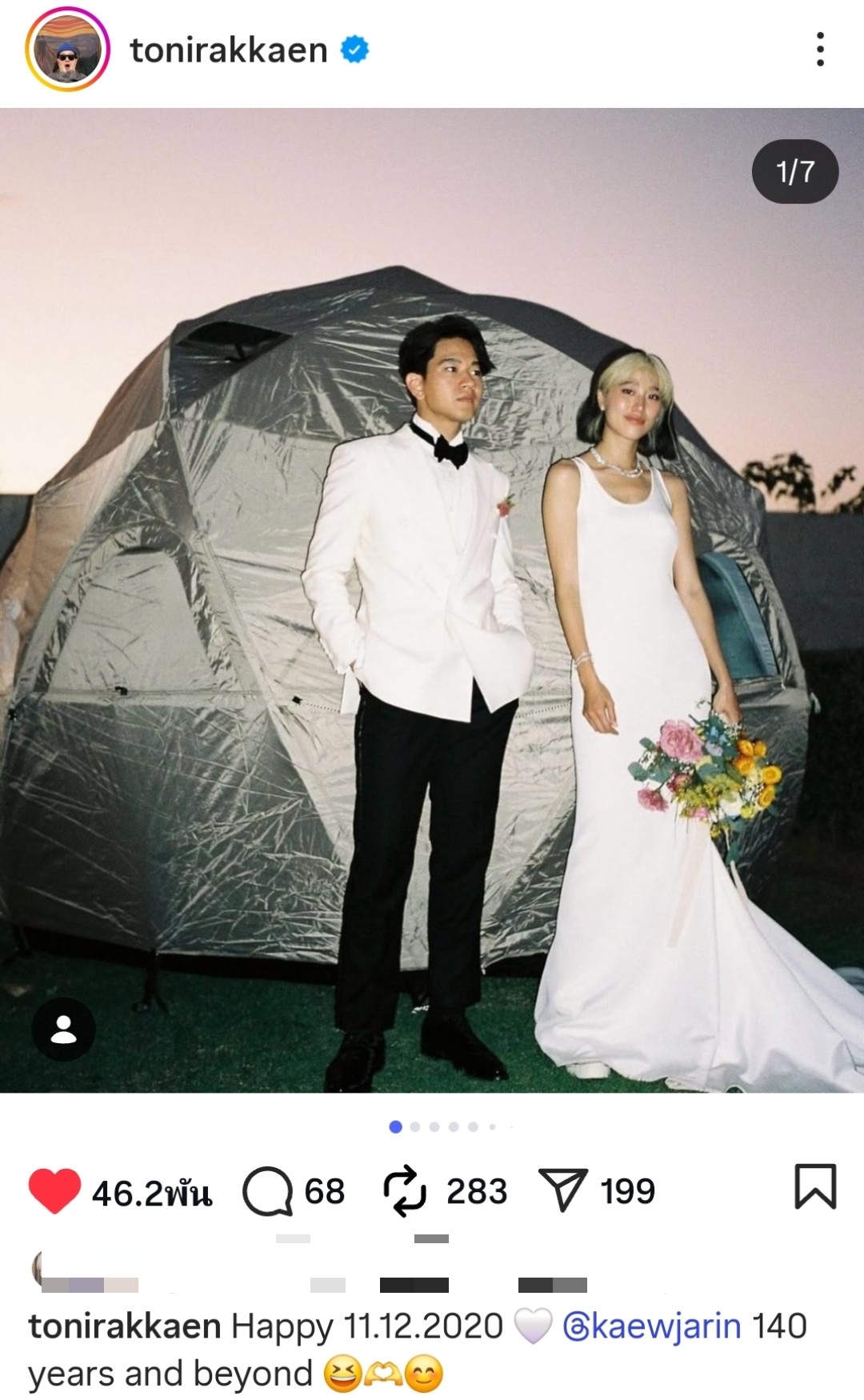 ​พร้อมเขียนแคปชั่นที่ทำเอาแฟน ๆ ใจละลายระคนอิจฉาว่า “Happy 11.12.2020 @kaewjarin 140 years and beyond” หรือแปลได้ว่า “มีความสุขนะ 11 ธ.ค. 2020 (วันแต่งงาน) 140 ปีและตลอดไป” เป็นการประกาศรักที่ยาวนานและมั่นคงไปจนถึงอนาคตที่ไกลแสนไกล