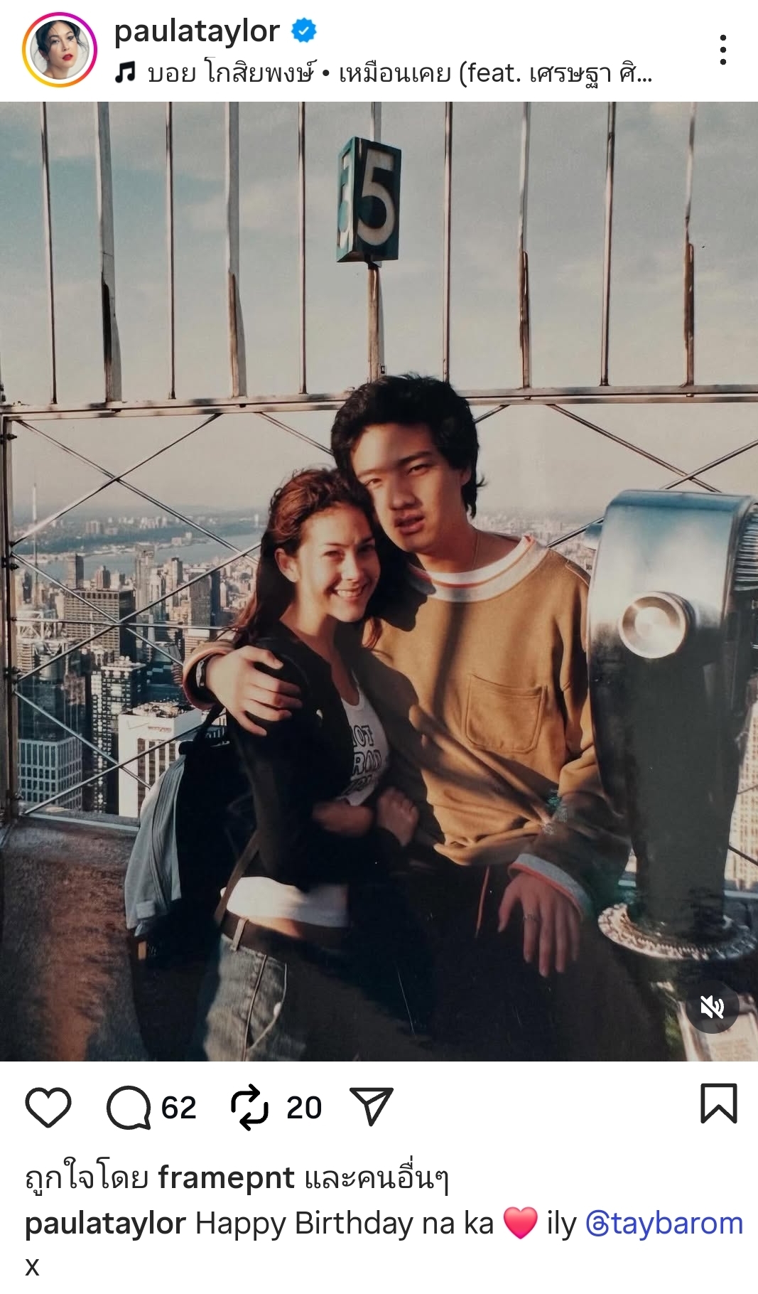 ​ภาพที่โพสต์ลงบนอินสตาแกรมส่วนตัว @paulataylor นั้นเป็นภาพคู่ที่น่ารักและอบอุ่นใจ โดยทั้งคู่อยู่ในอิริยาบถสบายๆ พร้อมรอยยิ้มที่เต็มเปี่ยมไปด้วยความสุข ณ สถานที่ที่คาดว่าจะเป็นจุดชมวิวแห่งหนึ่งในต่างประเทศ ซึ่งภาพดังกล่าวมาพร้อมกับแคปชั่นสั้นๆ แต่ความหมายลึกซึ้งว่า “Happy Birthday na ka 💖 ily @taybarom x” เป็นการตอกย้ำความรักที่มั่นคงและยาวนานของทั้งคู่