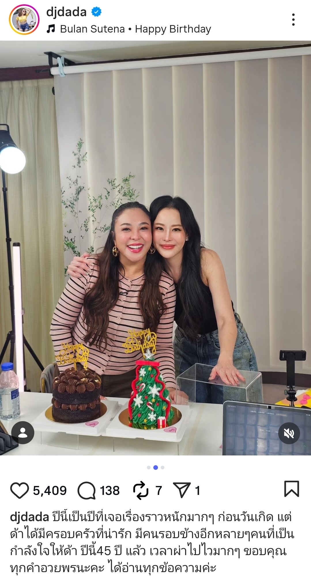 ​โดย ดีเจดาด้า ได้โพสต์ภาพความสุขพร้อมหน้าครอบครัว มีสามีและลูกสาวยกเค้กมาเซอร์ไพรส์อวยพรวันเกิด พร้อมข้อความที่ชวนน่าเห็นใจไม่น้อยว่า “ปีนี้เป็นปีที่เจอเรื่องราวหนักมาก ๆ ก่อนวันเกิด แต่ด้าได้มีครอบครัวที่น่ารัก มีคนรอบข้างอีกหลาย ๆ คนที่เป็นกำลังใจให้ด้า ปีนี้45 ปี แล้ว เวลาผ่านไปไวมากๆ ขอบคุณทุกคำอวยพรนะคะ ได้อ่านทุกข้อความค่ะ”