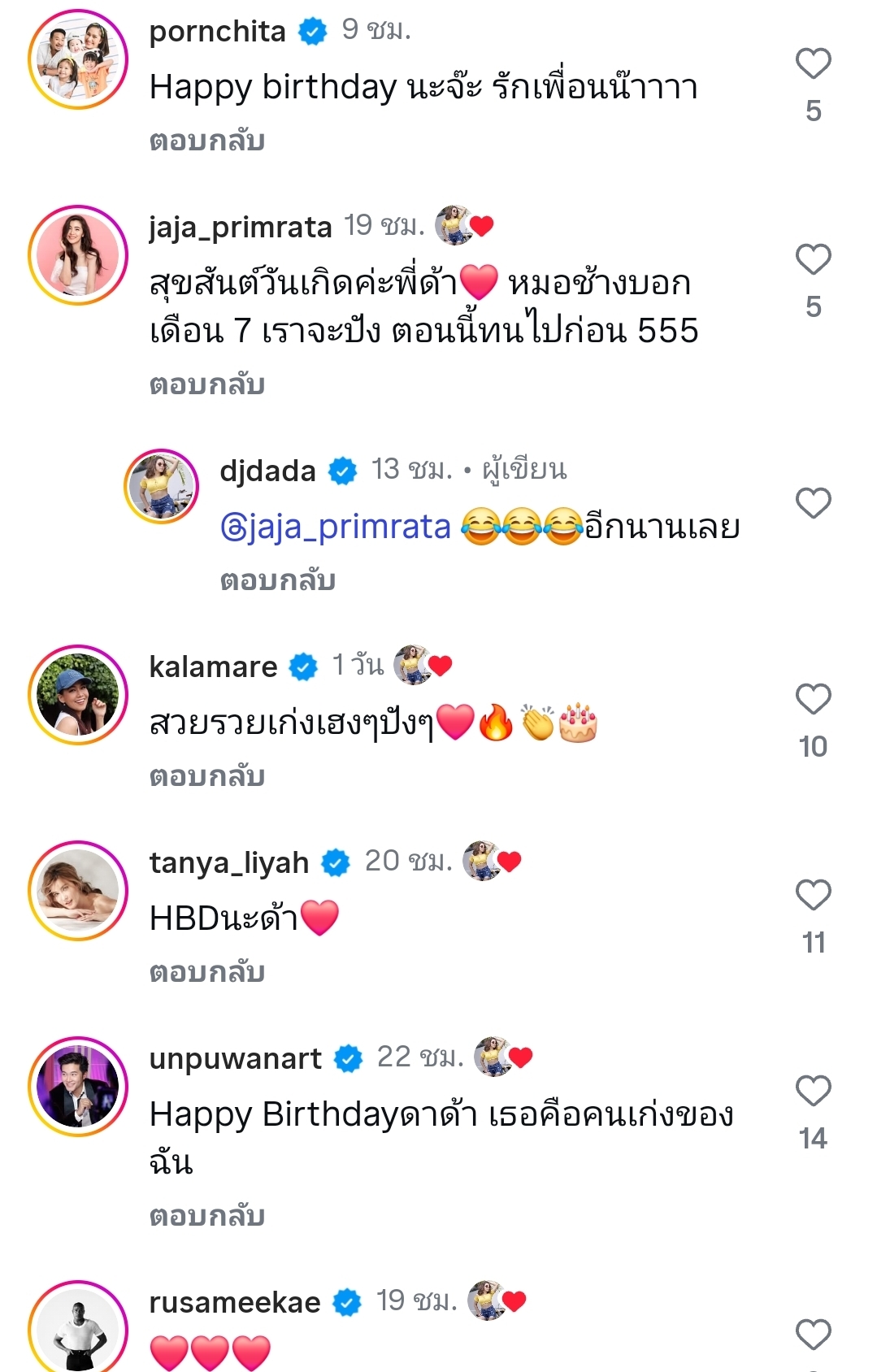 ​ทันทีที่โพสต์นี้ถูกเผยแพร่ เพื่อน ๆ พี่ ๆ น้อง ๆ ในวงการบันเทิงต่างก็รีบเข้ามาให้กำลังใจและอวยพรวันเกิดกันอย่างท่วมท้น อาทิ คำอวยพรที่ขอให้มีแต่สิ่งดี ๆ รออยู่หลังจากนี้ หรือข้อความที่ให้กำลังใจว่า “Happy Birthdayดาด้า เธอคือคนเก่งของฉัน” รวมถึงคำแนะนำจากเพื่อนซี้ที่อ้างถึงคำทำนายว่า “หมอช้างบอกเดือน 7 เราจะปัง ตอนนี้ทนไปก่อน 555” ซึ่งแสดงให้เห็นถึงความรักและมิตรภาพที่ทุกคนส่งให้ ดาด้า วรินดา ผ่านพ้นช่วงเวลาที่ยากลำบากไปให้ได้