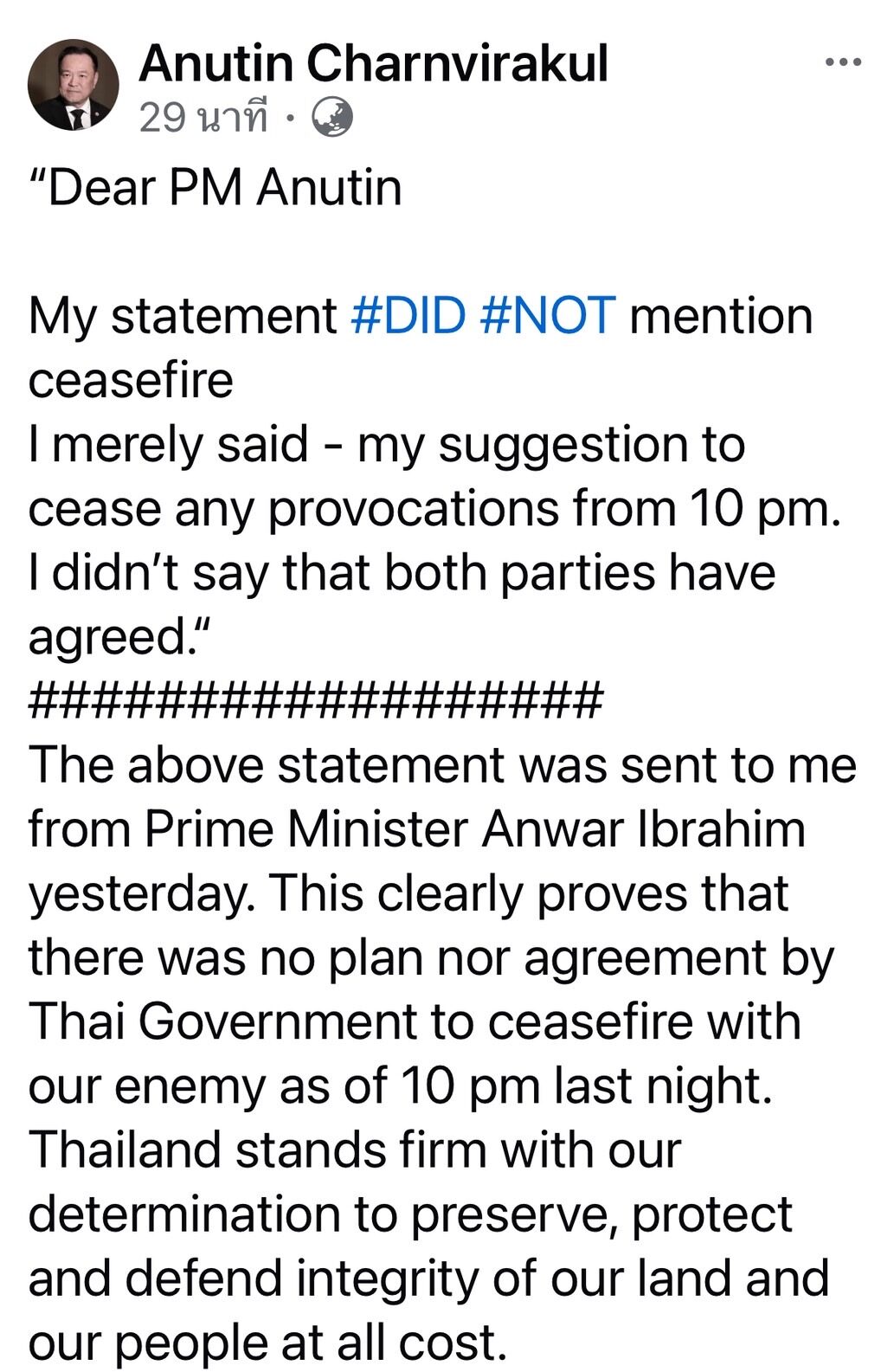 โดยนายอนุทิน ระบุว่า “แถลงการณ์ข้างต้น ถูกส่งมาถึงผม จากนายกรัฐมนตรี อันวาร์ อิบราฮิม เมื่อวานนี้ (13 ธ.ค.) ซึ่งพิสูจน์ได้อย่างชัดเจนว่า รัฐบาลไทยไม่มีแผนหรือข้อตกลงใดๆ ที่จะหยุดยิงกับศัตรูของเรา ตั้งแต่เวลา 22.00 น. ของเมื่อคืนนี้ ประเทศไทยยืนหยัดอย่างมั่นคงในการรักษา ปกป้อง และพิทักษ์บูรณภาพของแผ่นดิน และประชาชนของเรา อย่างสุดกำลัง”