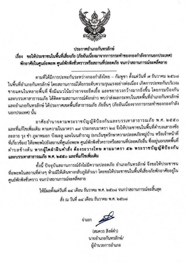 โดยระบุว่า ตามที่ได้มีการปะทะกันระหว่างกองกำลังไทย-กัมพูชา ตั้งแต่วันที่ 7 ธ.ค.68 ในพื้นที่ อ.กันทรลักษ์ โดยสถานการณ์ได้ยกระดับความรุนแรงอย่างต่อเนื่อง เกิดการปะทะกันบริเวณชายแดนในหลายพื้นที่ ซึ่งมีแนวโน้มว่าอาจจะยืดเยื้อ และขยายวงกว้างมากยิ่งขึ้น โดยกรมป้องกันบรรเทาสาธารณภัย ได้ติดตามสถานการณ์ดังกล่าว พบว่าส่งผลกระทบในเขตพื้นที่อำเภอกันทรลักษ์ ได้ประกาศเขตพื้นที่สาธารณภัย ภัยอื่น ๆ (ภัยอันเนื่องจากการกระทำของกองกำลังนอกประเทศ) นั้น
