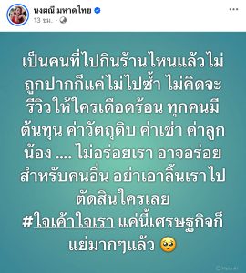 โดยจ๊ะระบุว่า ตนเป็นคนที่ไปกินร้านไหนแล้วไม่ถูกปากก็เลือกที่จะเงียบ ไม่ได้นำมารีวิวหรือวิจารณ์ให้ใครเดือดร้อน เพราะเข้าใจว่าทุกร้านมีต้นทุน ทั้งค่าวัตถุดิบ ค่าเช่า และค่าลูกน้อง พร้อมย้ำว่า “ไม่อร่อยสำหรับเรา อาจอร่อยสำหรับคนอื่น” และไม่อยากให้ใครนำลิ้นของตัวเองไปตัดสินคนอื่น