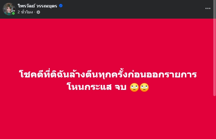 ทั้งนี้ แพรรี่ ได้โพสต์ข้อความว่า “โชคดีที่ดิฉันล้างตีนทุกครั้งก่อนออกรายการโหนกระแส จบ “