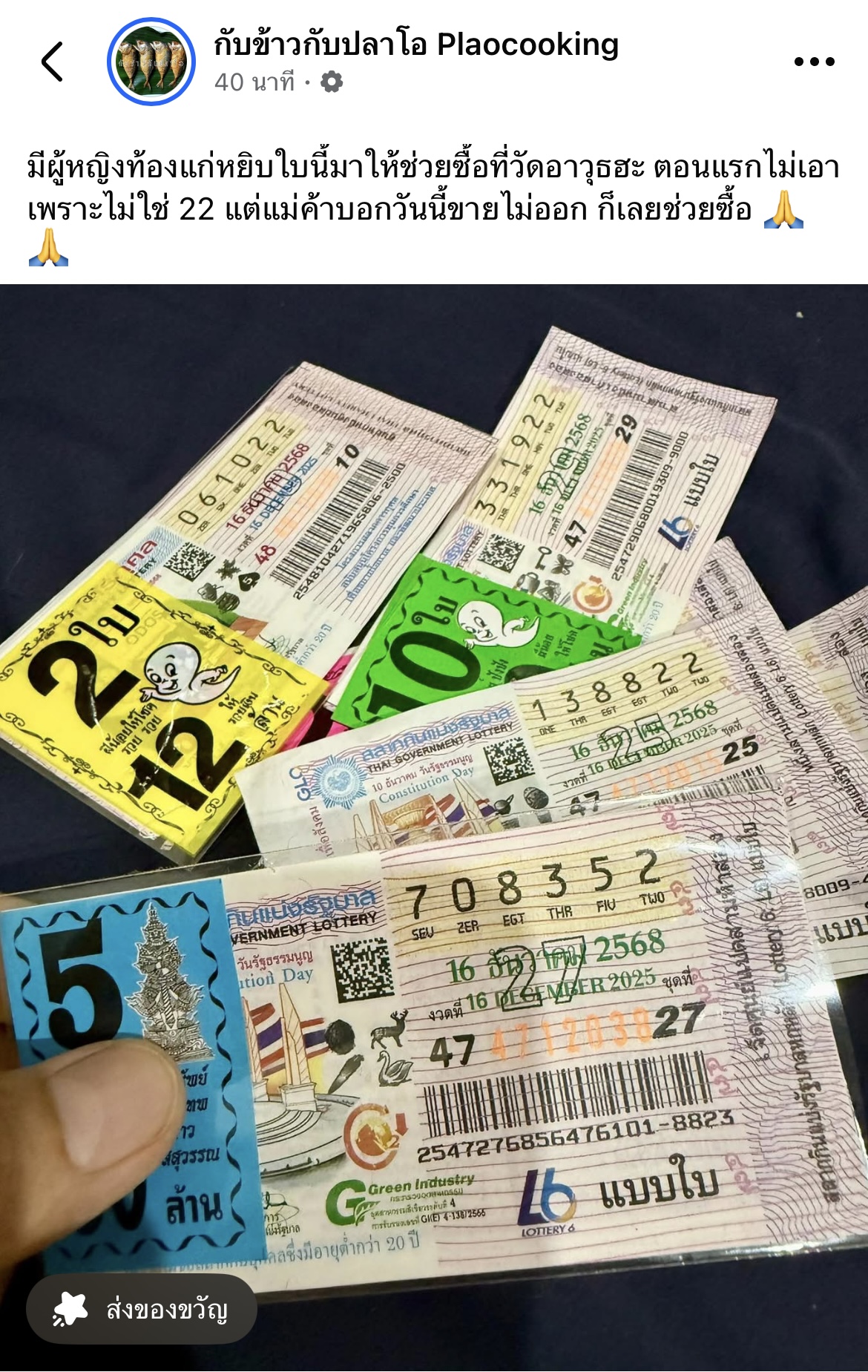 ก่อนหน้านี้ในงวดวันที่ 1 ธันวาคม 2568 แอดมินเพจ “กับข้าวกับปลาโอ” เคยกลายเป็นไวรัล หลังโพสต์ภาพลอตเตอรี่เลขท้ายสองตัว 22 ที่ถูกรางวัลแบบเต็ม ๆ นับเป็นการล้างอาถรรพ์หลังตามซื้อมานานกว่า 5 ปี พร้อมนำลอตเตอรี่ใส่กรอบทองไปให้พระเจิม เสริมความเป็นสิริมงคล จนแฟนคลับแห่ร่วมแสดงความยินดีกันอย่างล้นหลาม