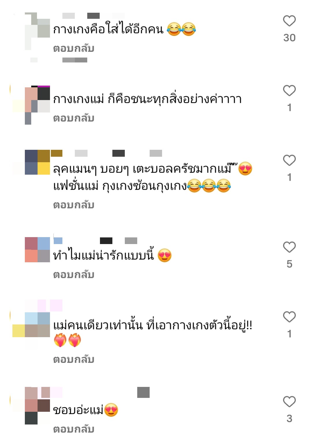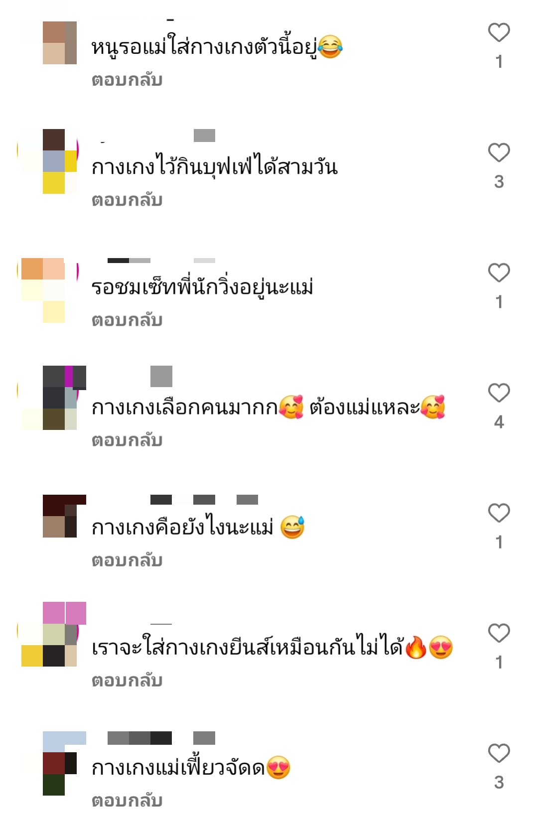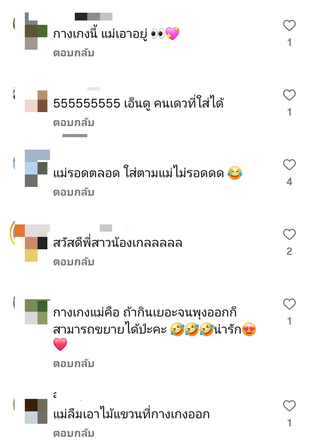 งานนี้ทันทีที่รูปถูกปล่อยออกมา เหล่าแฟนคลับและชาวเน็ตต่างตบเท้าเข้ามากดไลก์และคอมเมนต์กันรัวๆ จนไอจีแทบแตก ซึ่งคอมเมนต์ส่วนใหญ่ต่างพูดเป็นเสียงเดียวกันว่า “กางเกงตัวนี้มีแม่ชมเท่านั้นที่เอาอยู่!” บ้างก็แซวปนเอ็นดูว่า “กางเกงแม่คือใส่ได้อีกคนเลย”, “แม่ลืมเอาไม้แขวนออกหรือเปล่าคะ”, หรือแม้กระทั่ง “กางเกงตัวนี้เลือกคนใส่มากกก ต้องแม่แหละถึงจะรอด” และที่พีคที่สุดคือชาวเน็ตท่านหนึ่งบอกว่า “กางเกงแม่ไว้กินบุฟเฟต์ได้สามวันเลยค่ะ” เพราะพื้นที่เอวมันเหลือเฟือจริงๆ!